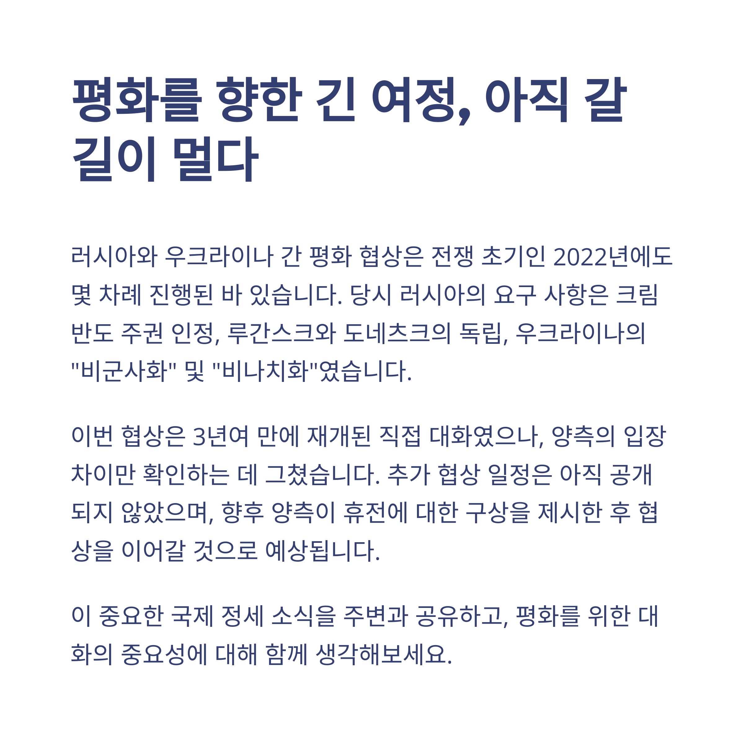 이번 회담, 여러분은 어떻게 보셨나요? 저도 기대 반 걱정 반으로 지켜봤는데, 솔직히 말하자면 한편으론 아쉬움이 컸어요. 그래도 오랜만에 얼굴을 맞댄 그 자체가 시작일 수 있다는 희망도 버릴 수 없더라고요. 앞으로 어떤 방식으로든 다시 협상이 이어지길, 그리고 언젠가 이 전쟁이 끝나길 간절히 바랍니다. 여러분도 이 주제에 대해 어떤 생각을 갖고 계신가요? 댓글로 나눠주시면 서로의 시야를 넓히는 데 큰 도움이 될 것 같아요. 우리, 계속 지켜보면서 이야기 나눠요.