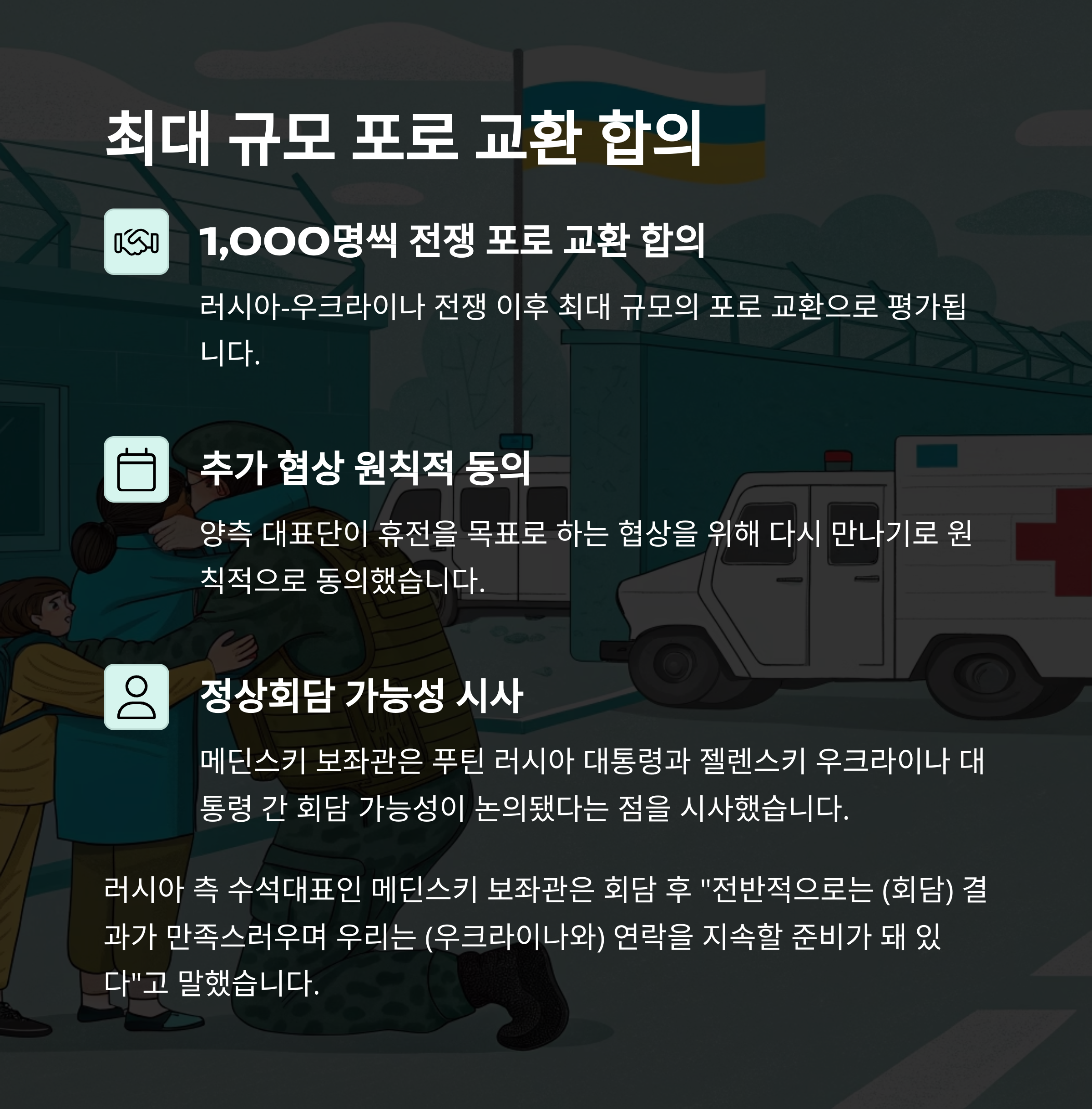| 포로 교환 | 양측 1,000명씩 포로 교환 합의 |