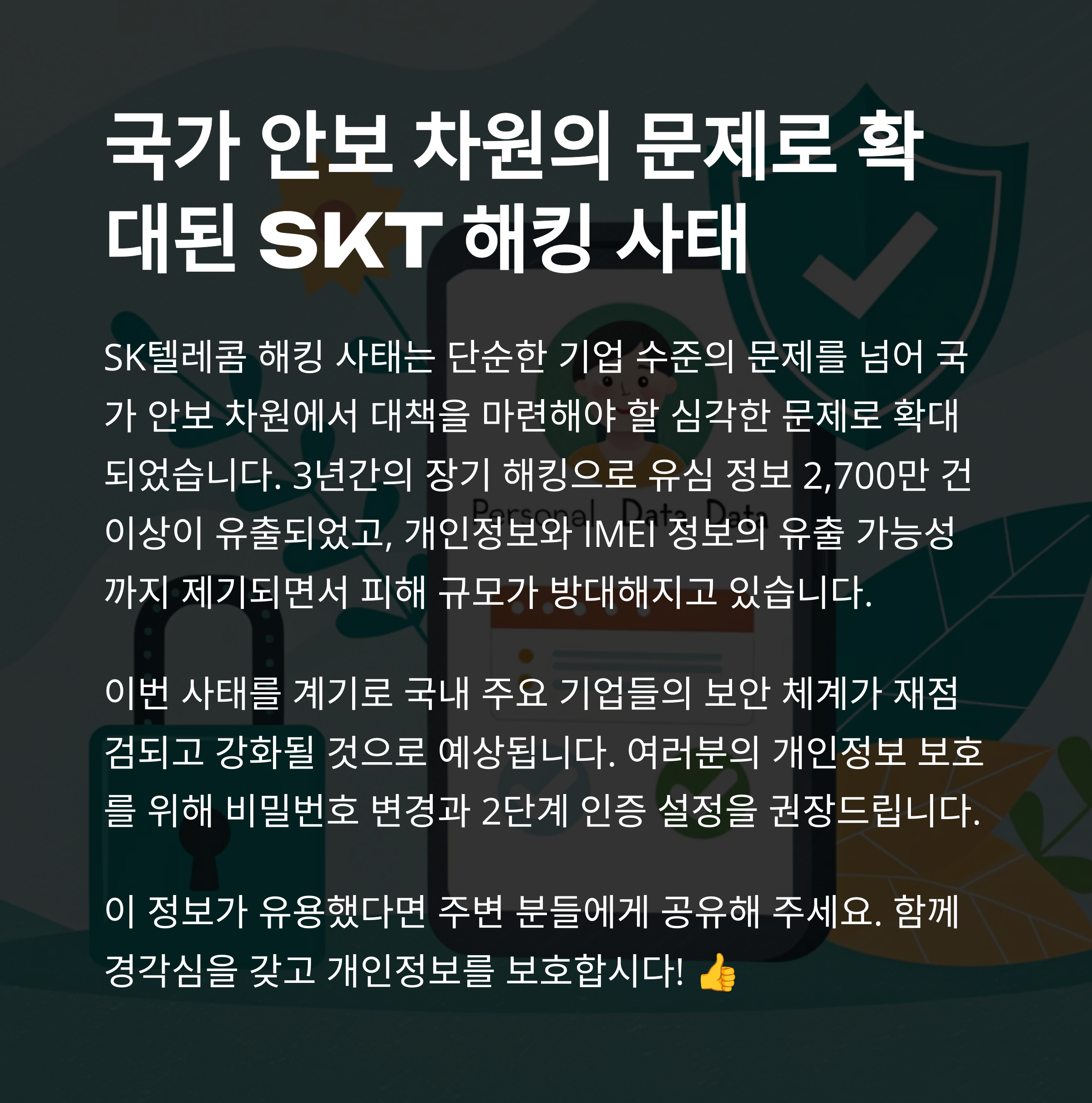 이번 SKT 해킹 사건은 단순한 통신사 보안 사고를 넘어, 우리 모두의 개인정보 보안에 대해 다시금 생각하게 만드는 계기가 되었습니다. 2,700만 건에 달하는 유심 정보, IMEI와 개인정보 유출 가능성까지... 누군가는 지금도 내가 모르는 사이 내 정보를 들여다보고 있을지 모릅니다. 하지만 우리가 할 수 있는 일은 있습니다. 스스로 보안 감수성을 높이고, 기업과 정부가 어떤 대응을 하고 있는지 끊임없이 관심을 가지는 거죠.
