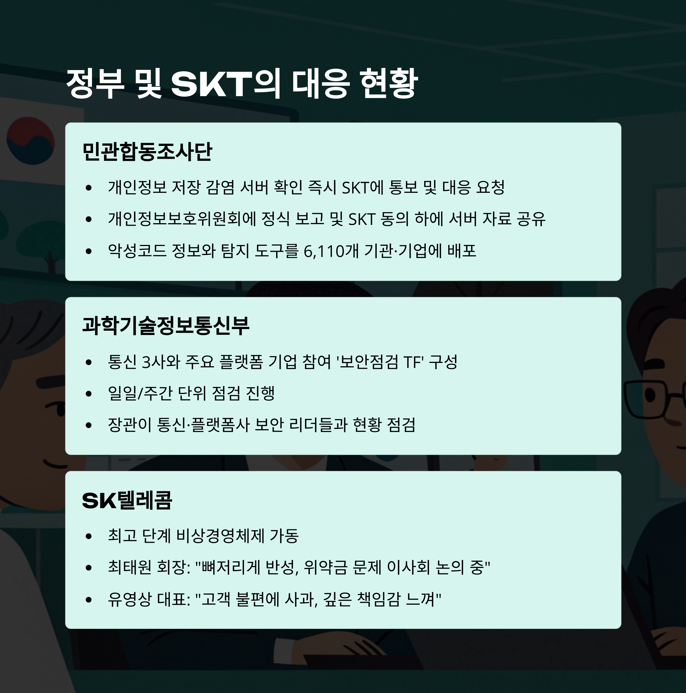정부도 가만히 있지 않았습니다. 민관합동조사단은 SKT에 즉각 감염 사실을 알리고, 개인정보보호위와 공조해 조치에 들어갔습니다. 과기정통부는 통신 3사 및 플랫폼 기업들과 함께 TF를 구성했고, SKT는 최고 단계의 비상경영체제를 가동했어요. 다음 표에서 주요 대응 현황을 한눈에 확인할 수 있습니다.