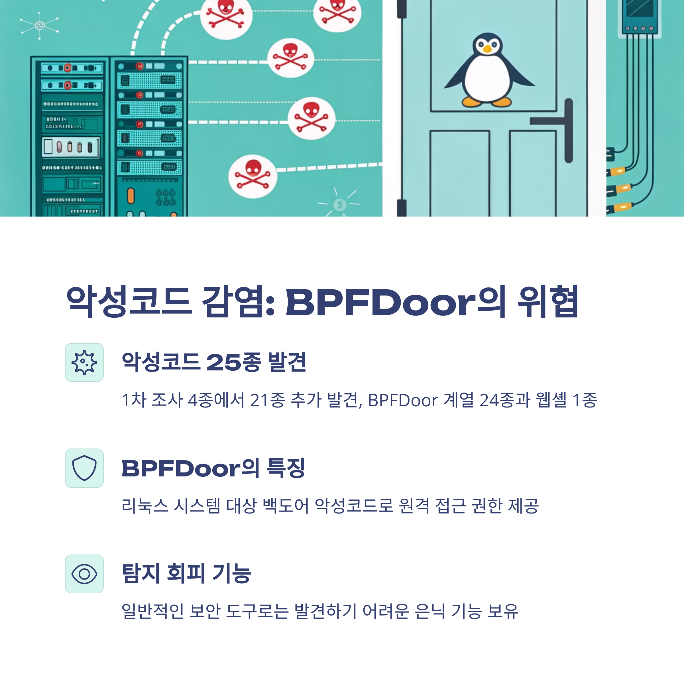 악성코드는 총 25종. 이 중 24종은 BPFDoor 계열, 나머지 1종은 웹셸입니다. BPFDoor는 리눅스 시스템에서 활동하며 탐지를 교묘히 회피하는 백도어 악성코드예요. 이전에는 4종만 발견됐는데, 이번 조사에서 무려 21종이 추가됐습니다. 여태까지 숨어있었다는 사실, 정말 소름이 돋죠?