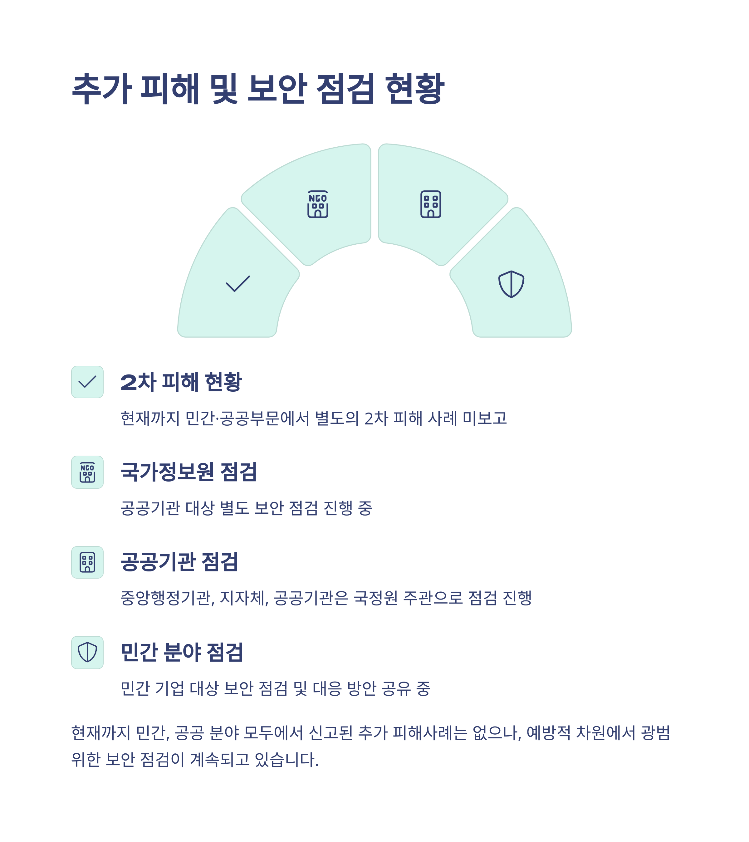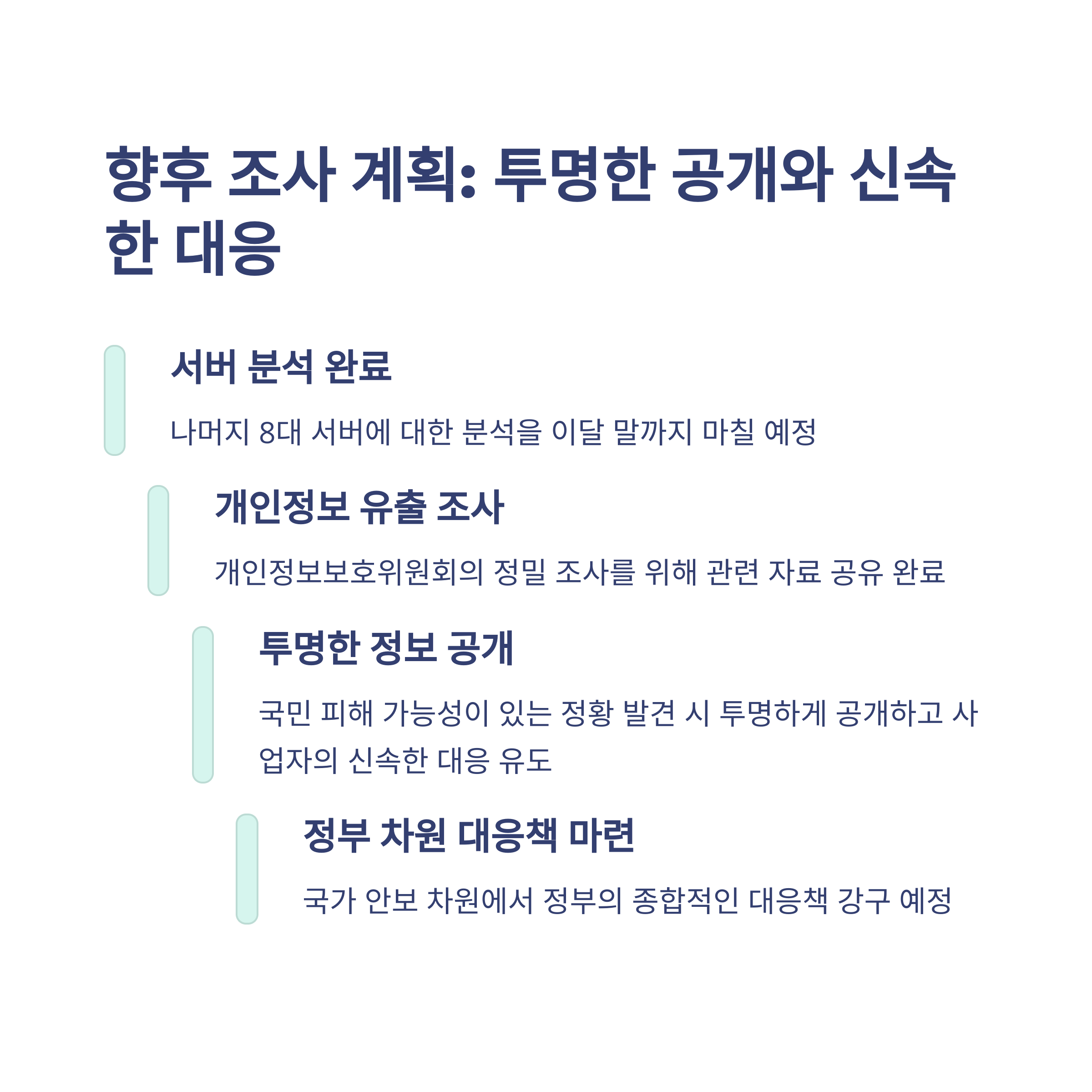 나머지 8대 서버에 대한 분석은 5월 말까지 완료될 예정입니다. 개인정보 유출 여부에 대해서는 개인정보보호위원회가 정밀 조사를 담당할 거고요. 그 외에도 국가정보원은 공공기관 보안 점검을 강화했고, 정부는 관련 정보를 계속 투명하게 공개할 계획이라고 밝혔습니다.