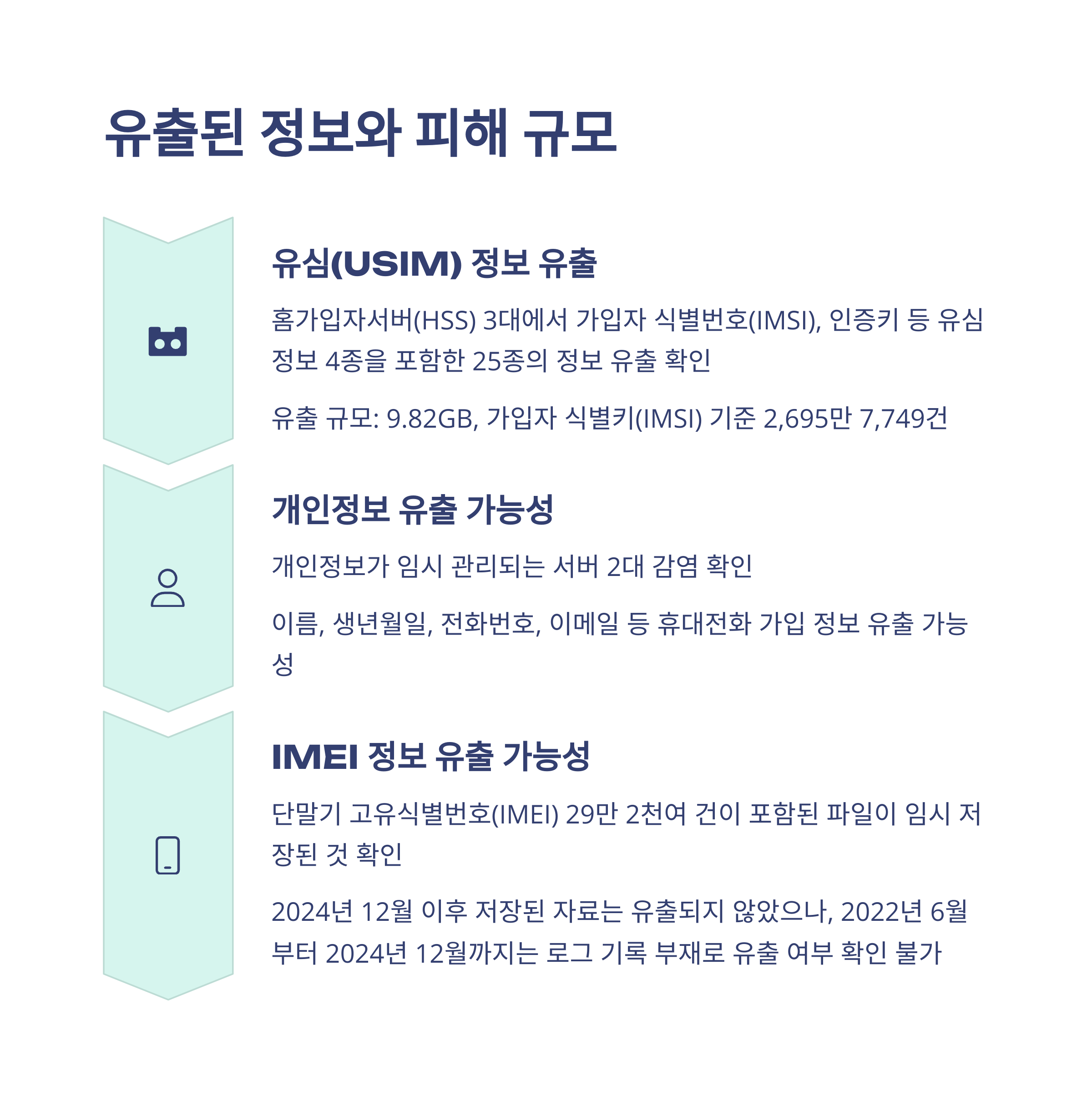 현재까지 피해 고객 개별 식별은 이뤄지지 않았으나, IMEI, 이름, 생년월일 등 일부 정보가 유출되었을 가능성이 있는 것으로 파악됩니다. SKT는 향후 유출 사실 확인 시 개별 통보 예정입니다.