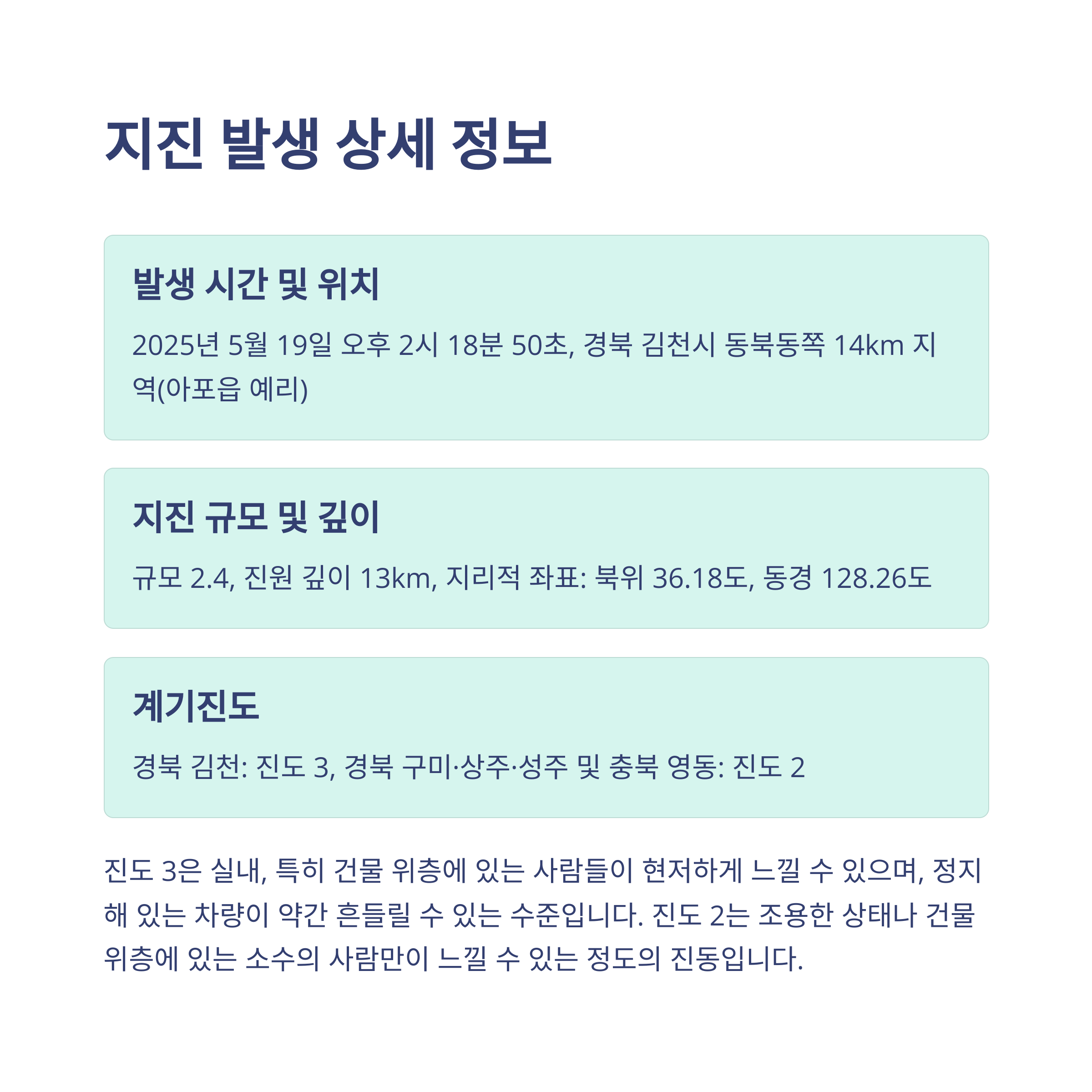 2025년 5월 19일 오후 2시 18분 50초, 경북 김천시 동북동쪽 14km 지점에서 규모 2.4의 지진이 발생했습니다. 진앙은 김천시 아포읍 예리 인근이며, 지리 좌표는 북위 36.18도, 동경 128.26도로 측정되었습니다. 지진의 진원 깊이는 약 13km로, 일반적으로 중간 깊이에 속하는 수준입니다. 규모 자체는 비교적 작지만, 해당 지역의 지질 조건이나 진원 깊이에 따라 체감 진도는 달라질 수 있기에 무시해서는 안 됩니다.