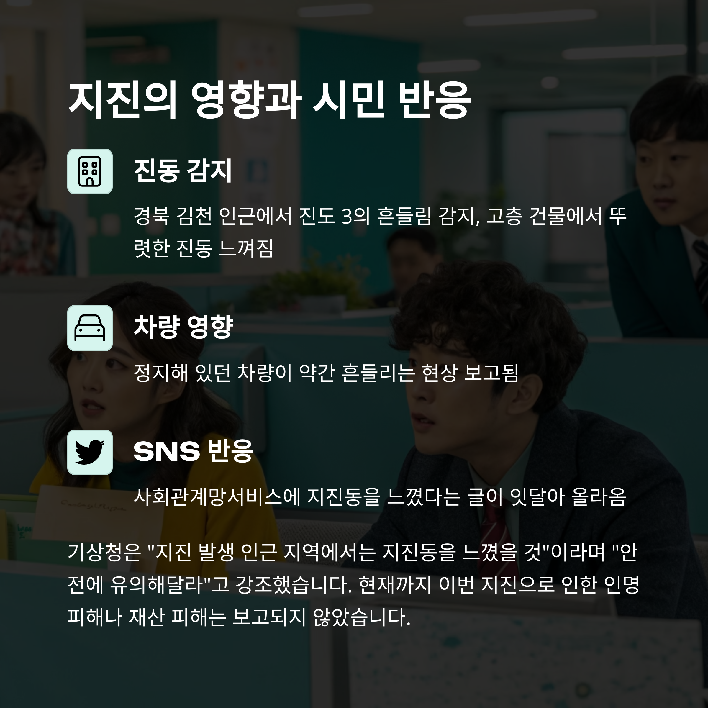 지진 발생 직후, 경북 김천을 비롯한 인근 지역 주민들은 SNS와 커뮤니티를 통해 체감 진동을 실시간으로 공유했습니다. 특히 고층 건물에 있던 시민들 사이에서는 뚜렷한 흔들림을 느꼈다는 증언이 이어졌습니다.