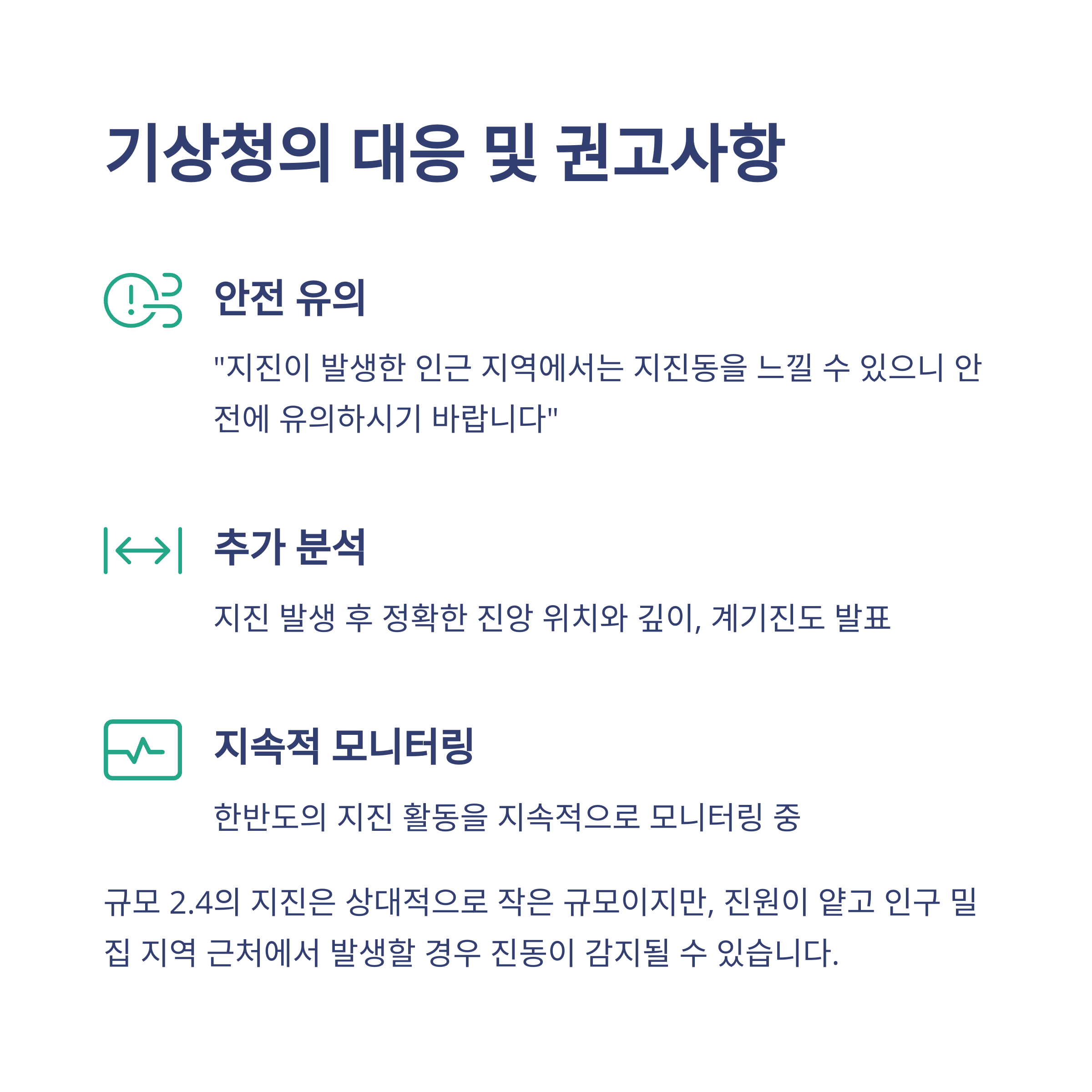 기상청은 "지진 발생 인근 지역에서는 진동이 감지될 수 있으니 침착하게 행동하고, 기상청이나 국민안전처 등 공공기관의 안내에 따를 것"을 강조하며, 한반도의 지진 활동을 지속적으로 모니터링하고 있습니다.