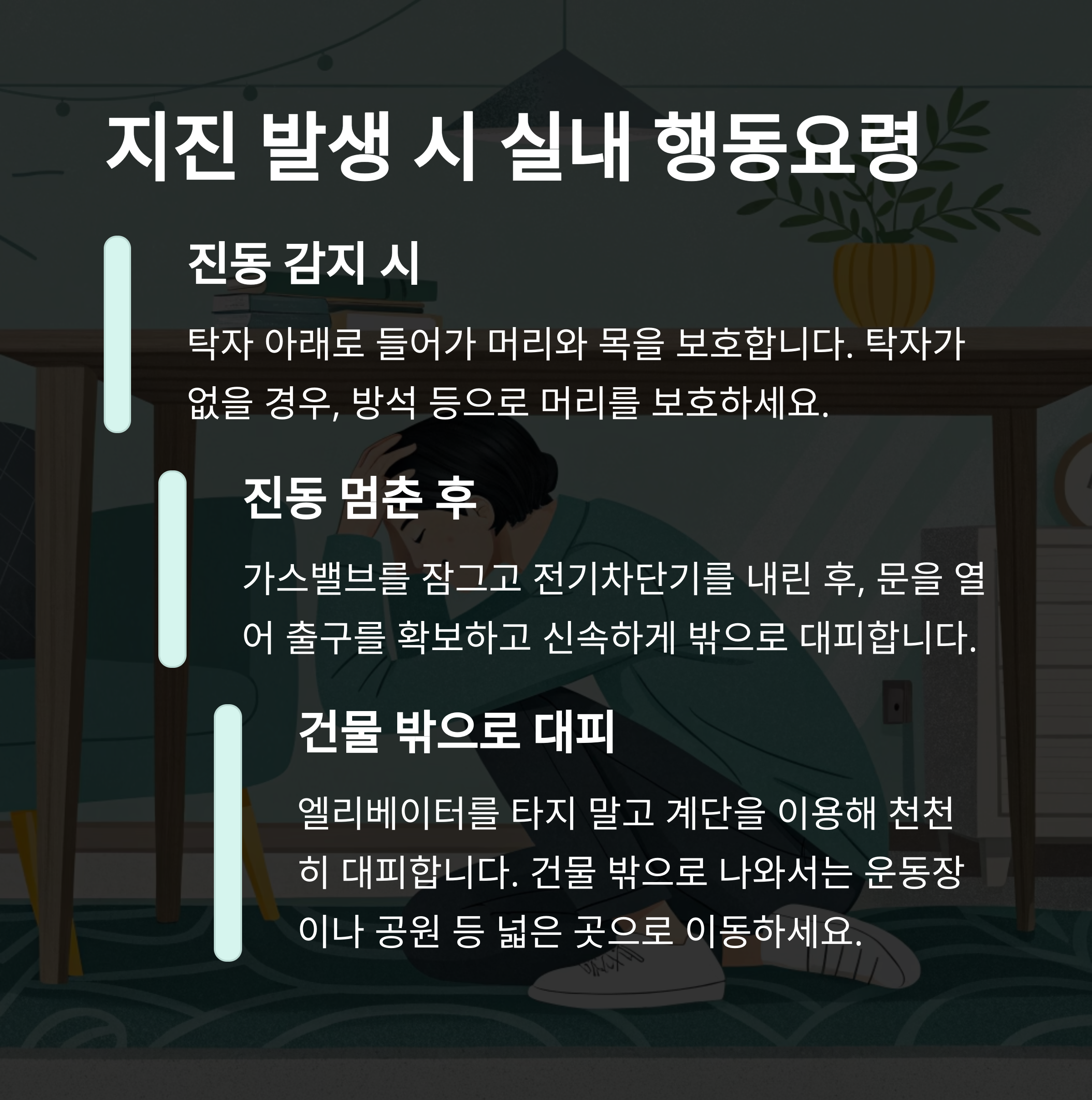 진동을 느끼면 탁자 아래로 몸을 피하고, 머리를 보호하는 것이 최우선입니다.