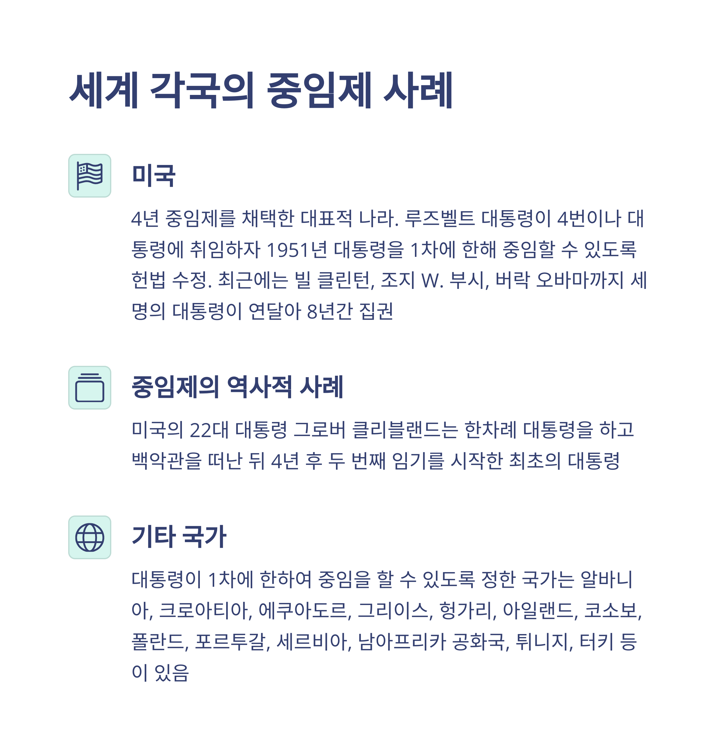중임제를 채택한 대표적 국가는 미국이에요. 루즈벨트가 4선까지 하자, 1951년 수정헌법으로 1회 중임만 허용하게 바꿨죠. 그 외에도 폴란드, 터키, 남아공 등도 중임제를 도입하고 있고, 대부분 4~5년 임기에 1회 중임 허용을 기본 틀로 삼고 있어요.