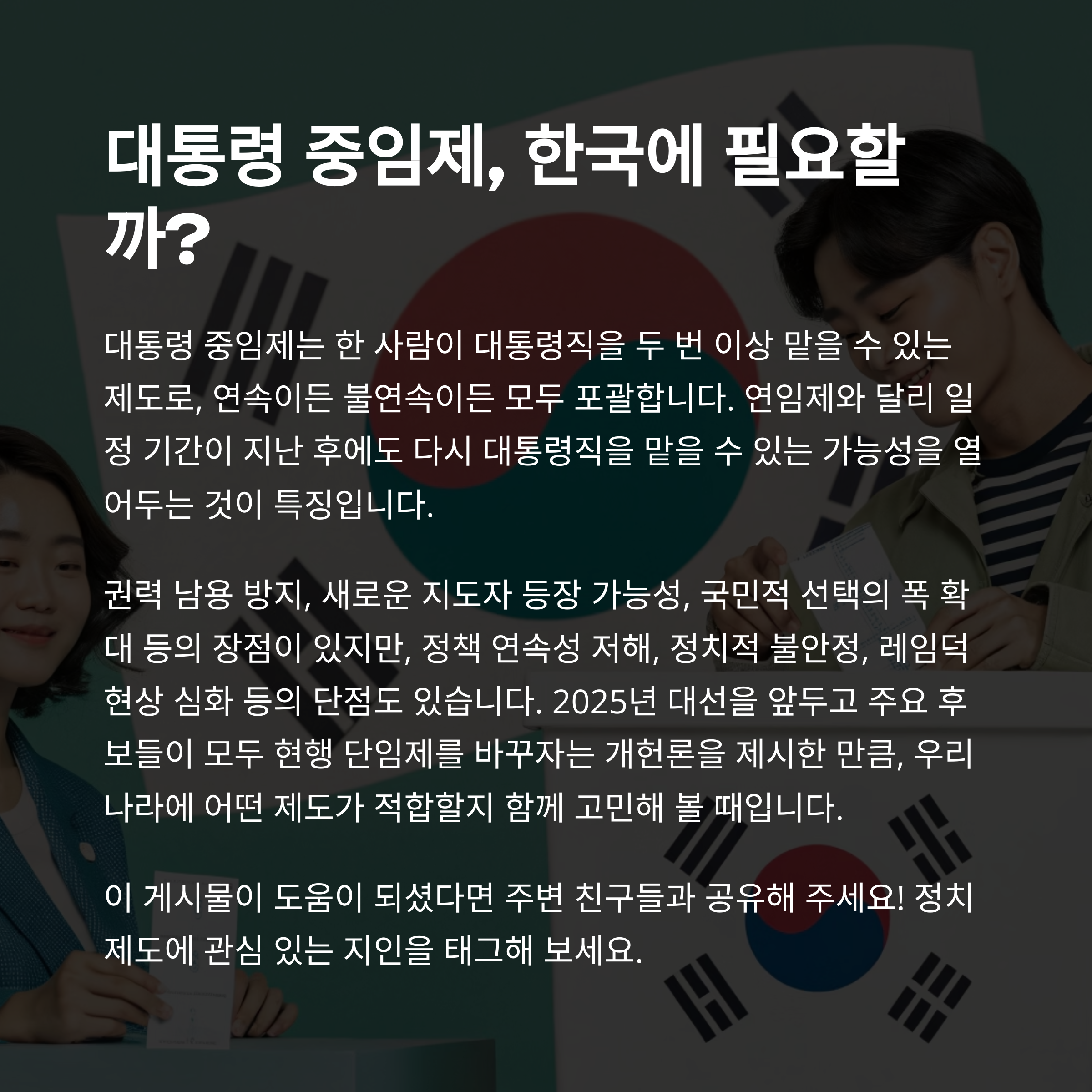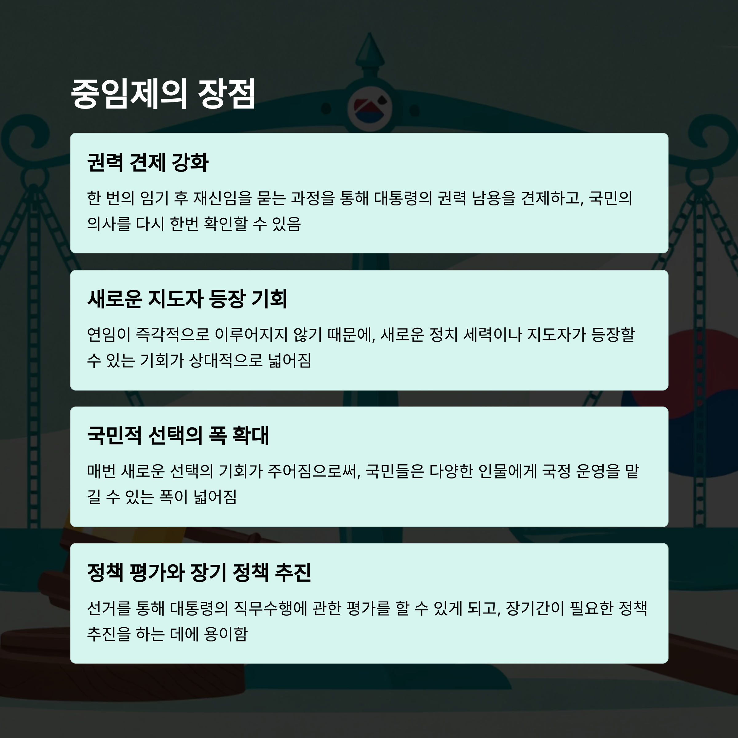 중임제는 장점도 많고 단점도 분명한 제도예요. 솔직히 장기 집권이 될 수도 있지만, 국민의 선택 폭도 넓어지고, 대통령도 긴 호흡으로 정책을 밀어붙일 수 있거든요.