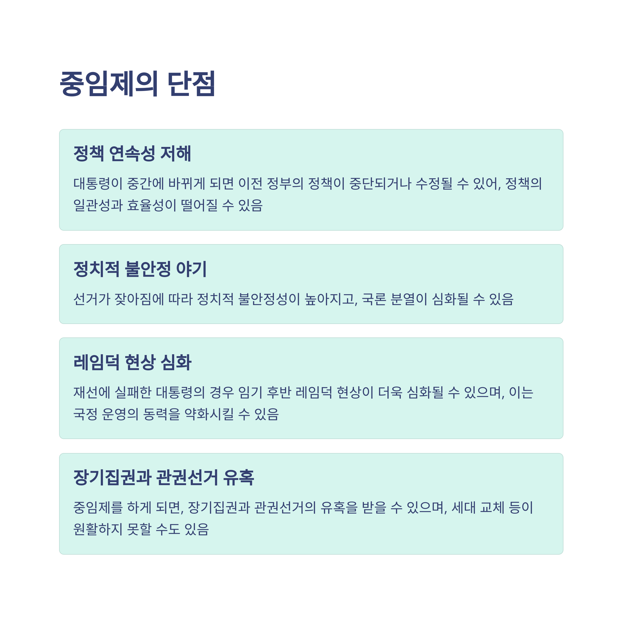 - 단점으로는 레임덕 심화 가능성, 정치적 불안정성 우려 존재