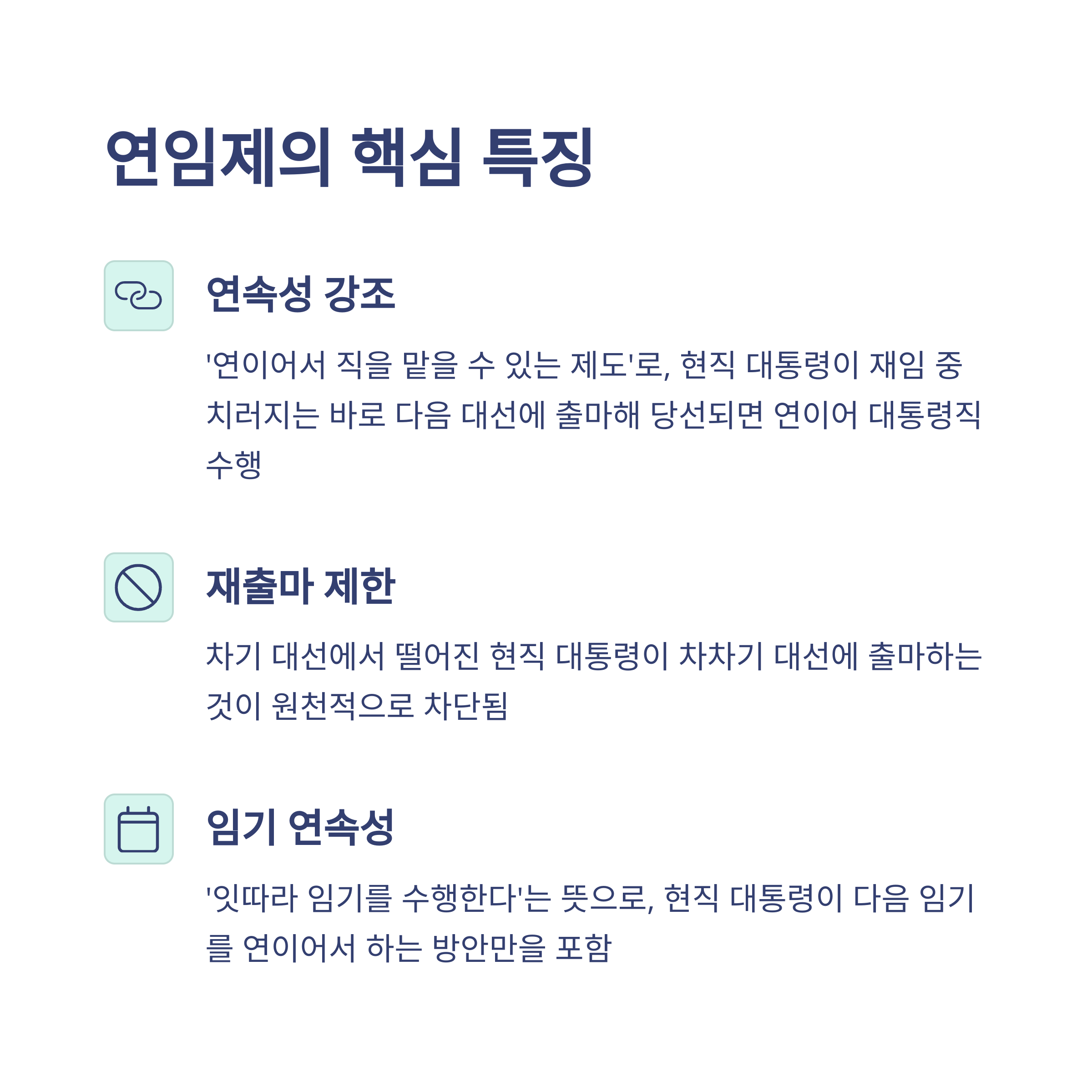 중임제와 연임제, 이름은 비슷하지만 핵심은 “연속성”에 있어요. 연임제는 '바로 다음' 임기만 가능해요. 반면, 중임제는 바로 다음이든 나중이든, 한 번 더 대통령직에 도전할 수 있는 거죠.