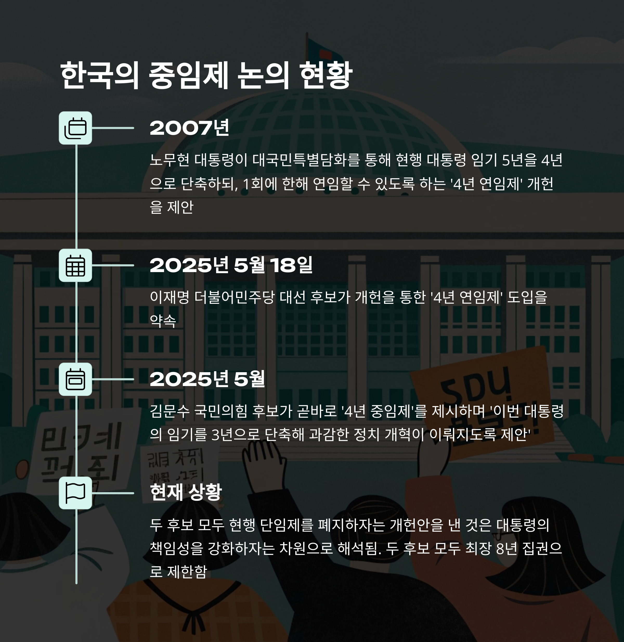 2025년 대선을 앞두고 이재명, 김문수 두 후보가 동시에 '중임제 개헌' 카드를 꺼내들었어요. 이재명은 '4년 연임제', 김문수는 '4년 중임제'를 주장했죠. 이들의 공통점은 '최장 8년 집권'을 제한으로 설정한 거예요. 그 외에도 과거 노무현 대통령이 2007년에 '4년 연임제' 개헌을 제안했던 적이 있었고요. 이런 흐름을 보면, 중임제 논의는 일회성 이슈가 아니라 꾸준히 제기되어 온 정치적 과제라는 걸 알 수 있죠.