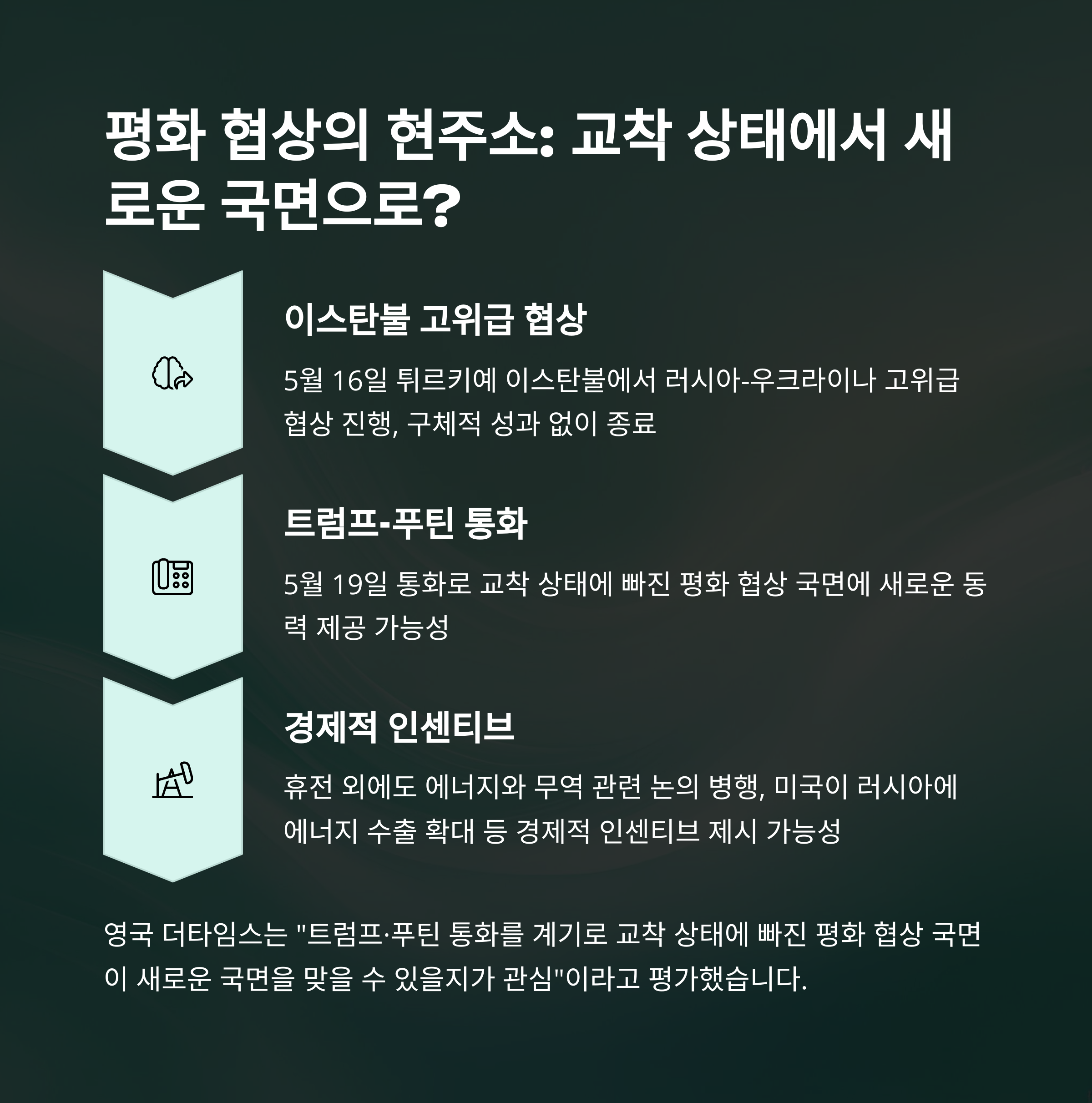 5월 16일 이스탄불에서 재개된 우크라이나-러시아 간 고위급 협상은 결실을 보지 못하고 종료됐습니다. 후속 일정조차 정해지지 않은 상황이죠. 트럼프-푸틴 통화가 이런 교착 상태를 뚫을 수 있을지 주목됩니다.