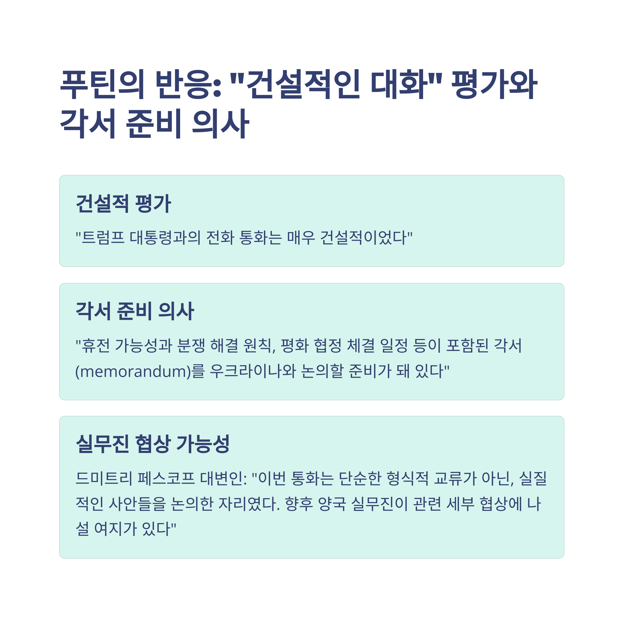 푸틴은 통화 후 “건설적인 대화였으며, 우크라이나와의 평화 협상을 위한 각서 작업 준비가 되어 있다”고 밝혔습니다. 이는 구체적인 협상 문서, 즉 '프레임워크'를 만들 준비를 하겠다는 의미로 해석됩니다. 이 말이 그냥 외교적 수사인지, 실제 행동으로 이어질지 미지수지만, 어쨌든 푸틴도 지금 상황을 오래 끌고 가고 싶지는 않은 모양이에요.