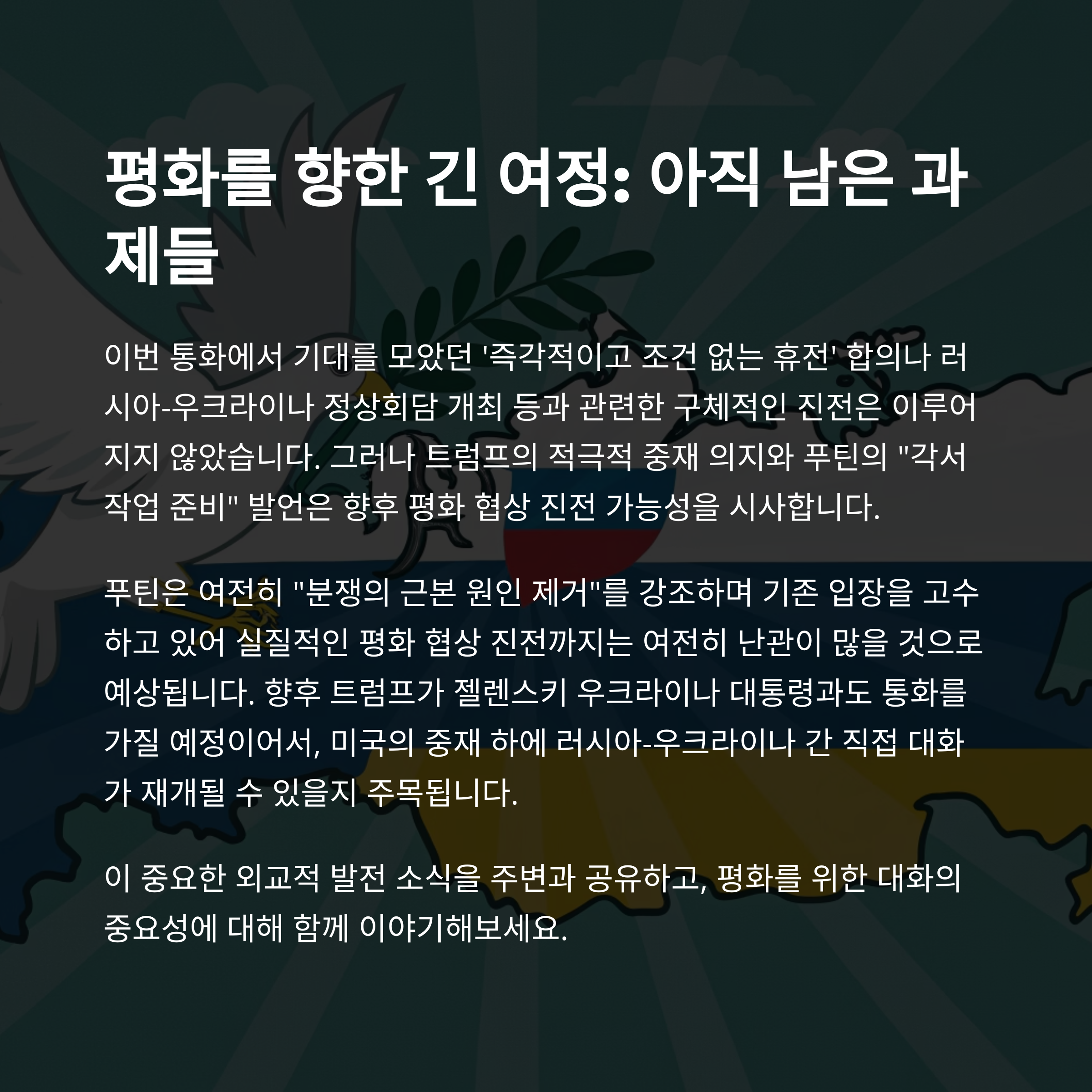 이번 푸틴-트럼프 통화는 단순한 외교 이벤트를 넘어, 전쟁이라는 긴 터널 속에서 새로운 출구가 열릴지도 모른다는 희망을 안겨줬습니다. 물론 정치와 전쟁의 현실은 복잡하지만, 적어도 대화의 문이 다시 열린 지금, 우리는 그 작은 가능성에 기대를 걸어도 되지 않을까요? 여러분의 생각은 어떤가요? 댓글로 함께 이야기 나눠보면 좋겠어요.