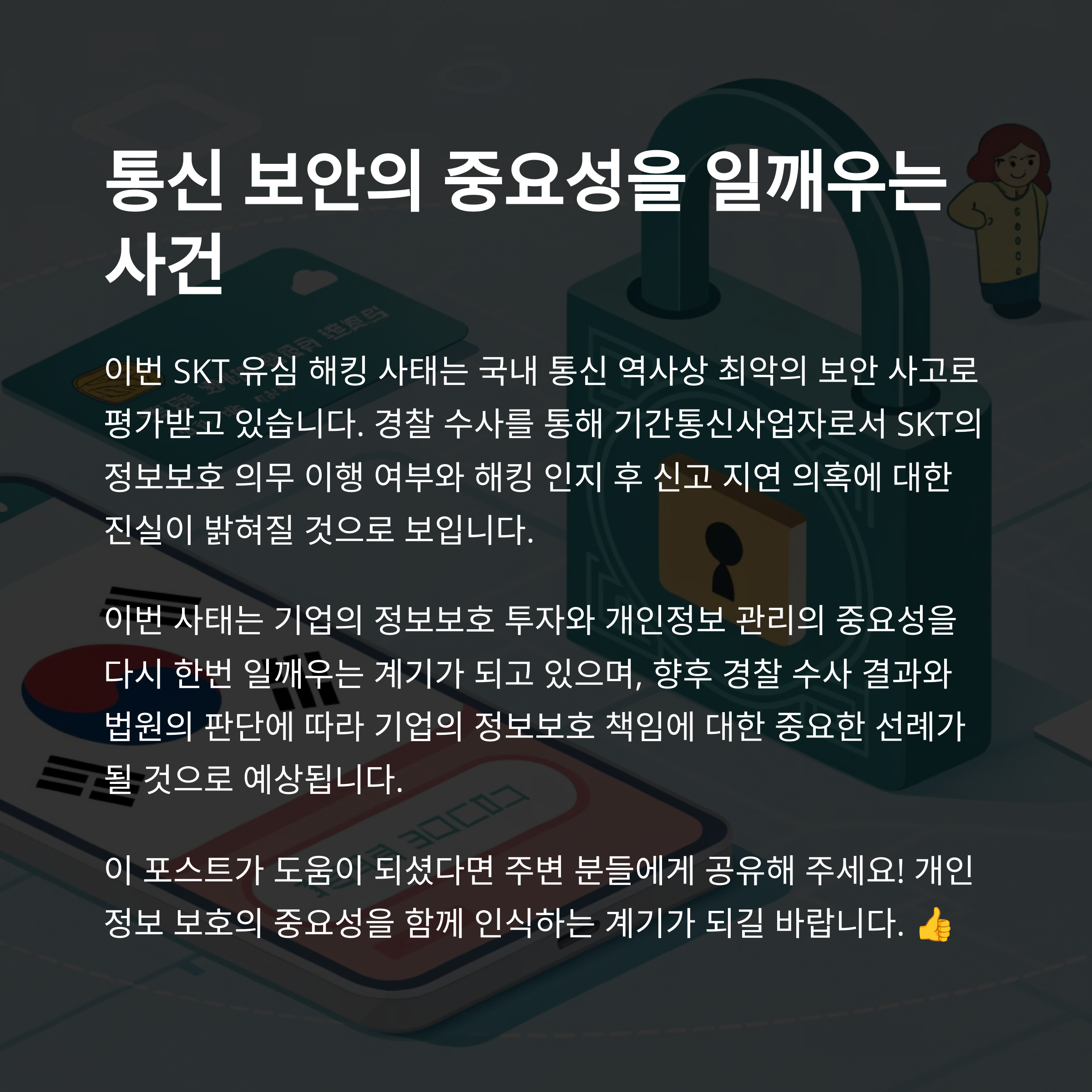이번 SKT 해킹 사태는 국내 통신망 보안에 대한 경각심을 높이는 중요한 계기가 될 것으로 보여요. 정부와 통신사들은 앞으로 정보보호 투자와 보안 시스템 강화에 더욱 집중하고, 관련 법규도 보다 엄격하게 적용될 가능성이 높습니다. 특히 유심과 같은 민감한 정보 관리 시스템에 대한 전반적인 재점검과 함께, 상시 모니터링 및 침해 사고 발생 시 신속한 대응 체계 구축이 더욱 강조될 것입니다.