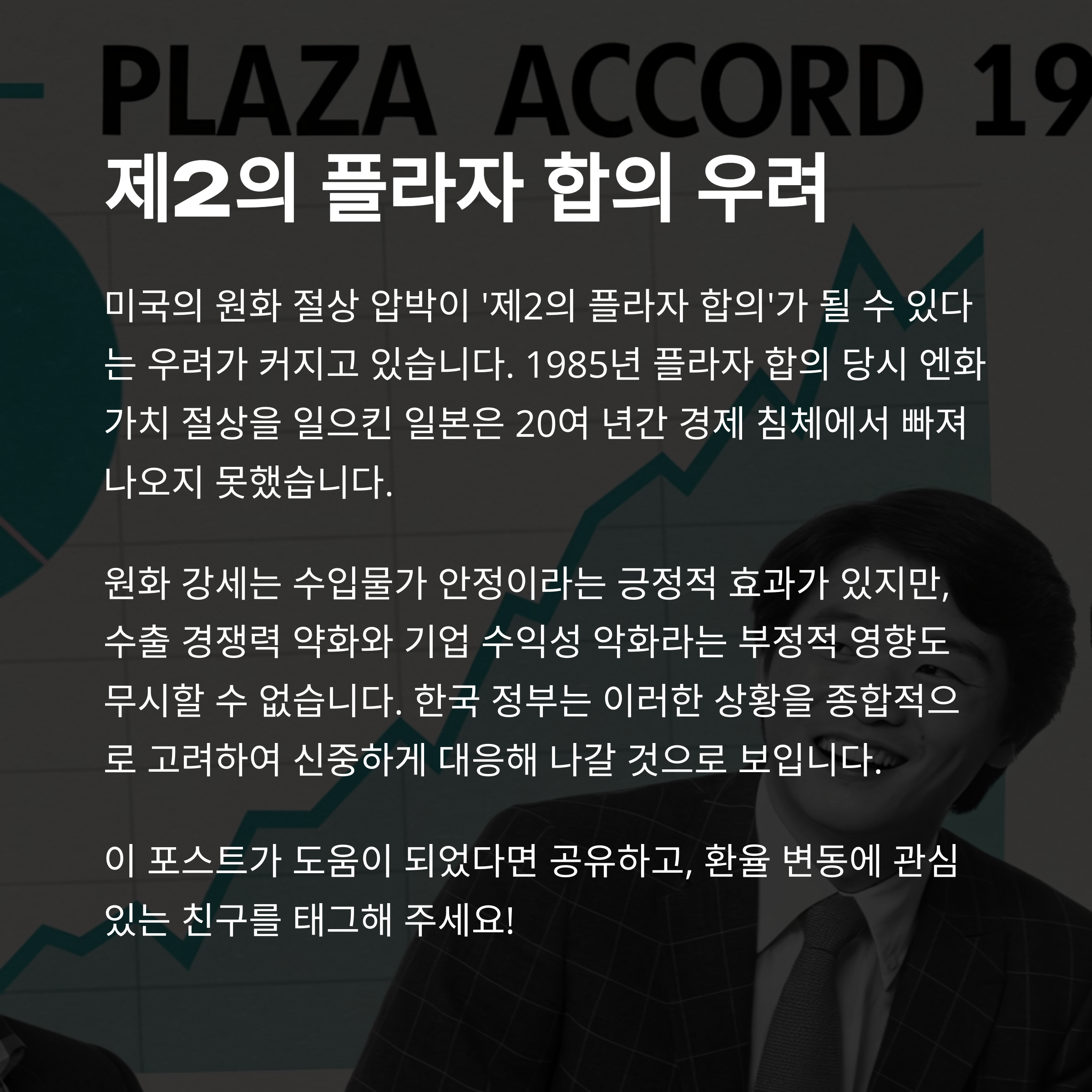 • 정부의 신중한 대응: 플라자 합의의 선례를 고려하여 인위적인 절상 유도보다는 시장 상황을 면밀히 모니터링하며 필요시 시장 안정 조치를 취할 것으로 예상됩니다.