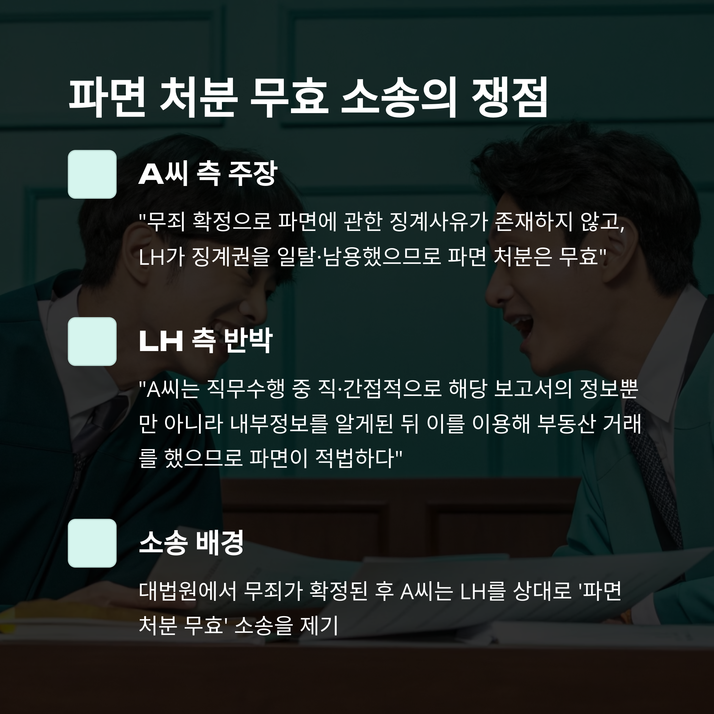 형사 재판에서 무죄가 확정되자, A씨는 LH를 상대로 행정소송에 나섰습니다. “무죄를 받았는데 왜 파면은 유지되느냐?”는 것이 주된 논리였죠. 반면 LH는 “형사 책임과 별개로, 내부 정보를 이용한 정황은 명확하므로 파면은 타당하다”고 맞섰습니다. 이 소송은 결국 법원까지 가게 되었고, 1심 재판부는 징계 사유가 명확하지 않다며 A씨의 손을 들어주었습니다. 이는 조직 내부 징계권의 한계를 드러낸 대표 사례로도 회자됩니다.