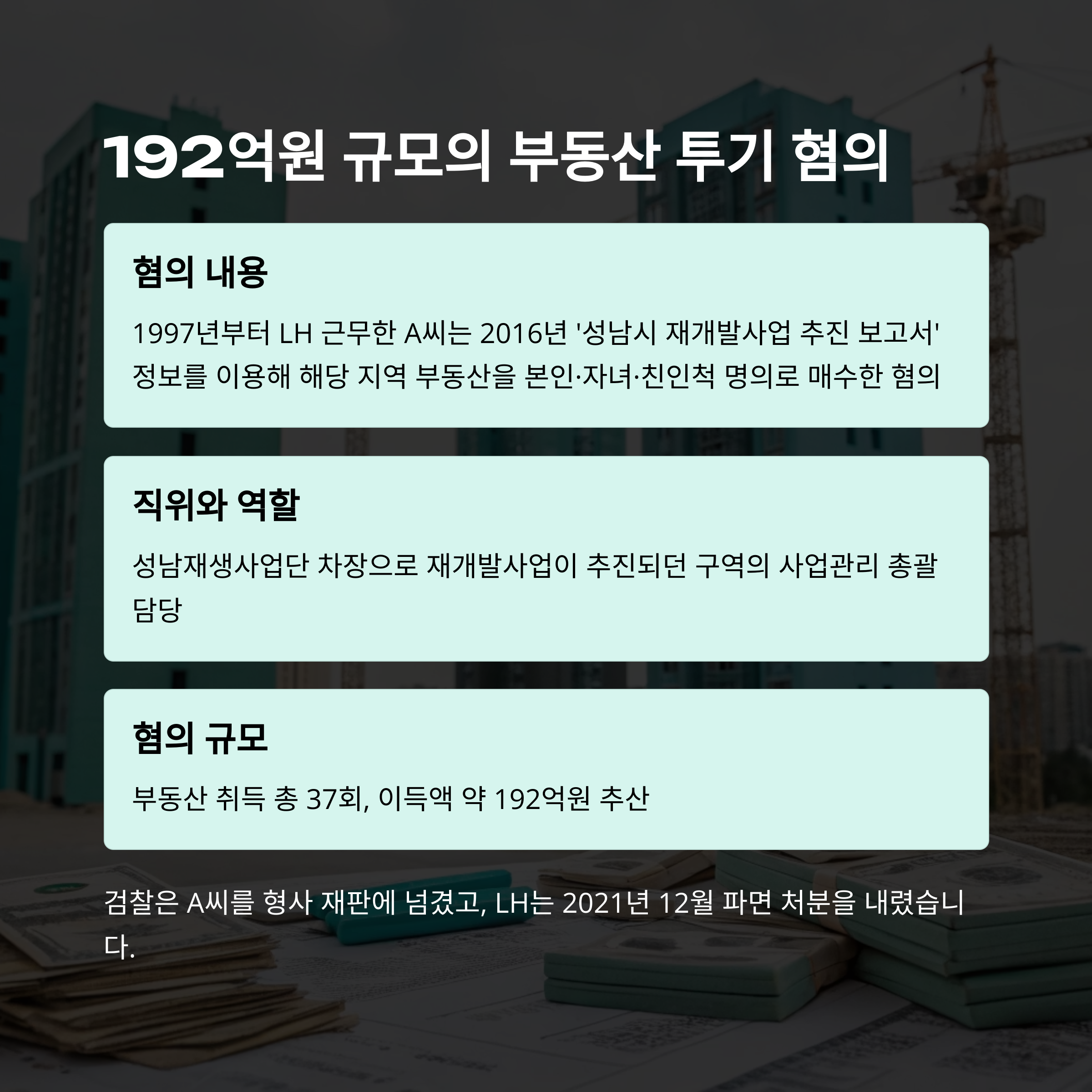 이 사건의 중심에는 성남시 재개발사업이라는 키워드가 있어요. 1997년부터 LH에 몸담았던 A씨는 2016년, 성남재생사업단 차장으로 근무하면서 관련 보고서를 접하게 됩니다. 이 보고서는 대외비로 분류되어 있진 않았지만, 재개발 예정 지역의 상세한 추진 계획이 담겨 있었죠. 이후 A씨는 본인 명의는 물론 자녀, 친인척 명의로 해당 지역 부동산을 다수 매입했고, 그 횟수가 무려 37차례에 달했다는 점이 알려지며 파문이 일었습니다.