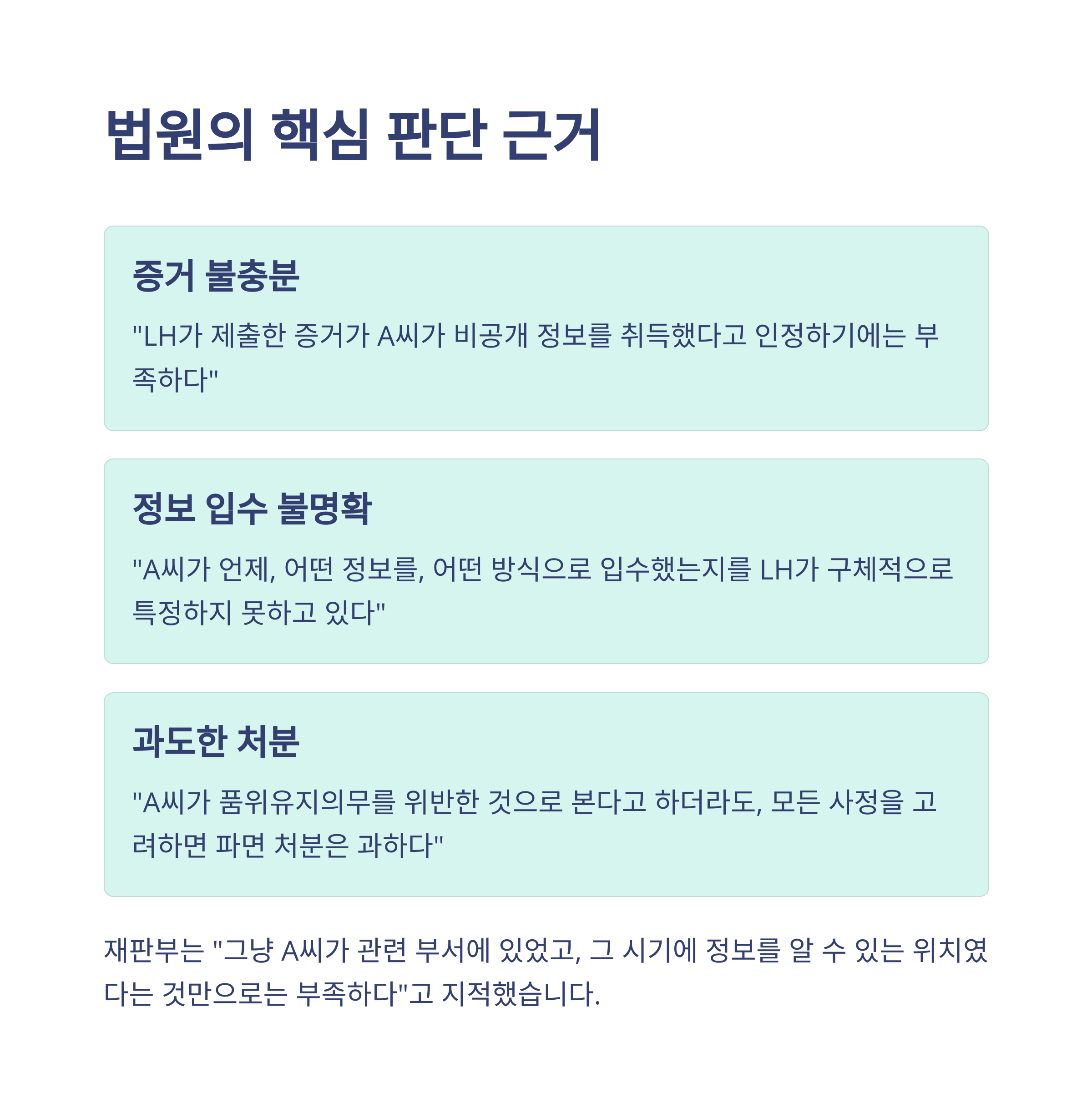 LH가 A씨가 비공개 정보를 취득했다는 명확한 증거를 제시하지 못했고, 파면은 과도한 징계라고 봤습니다.