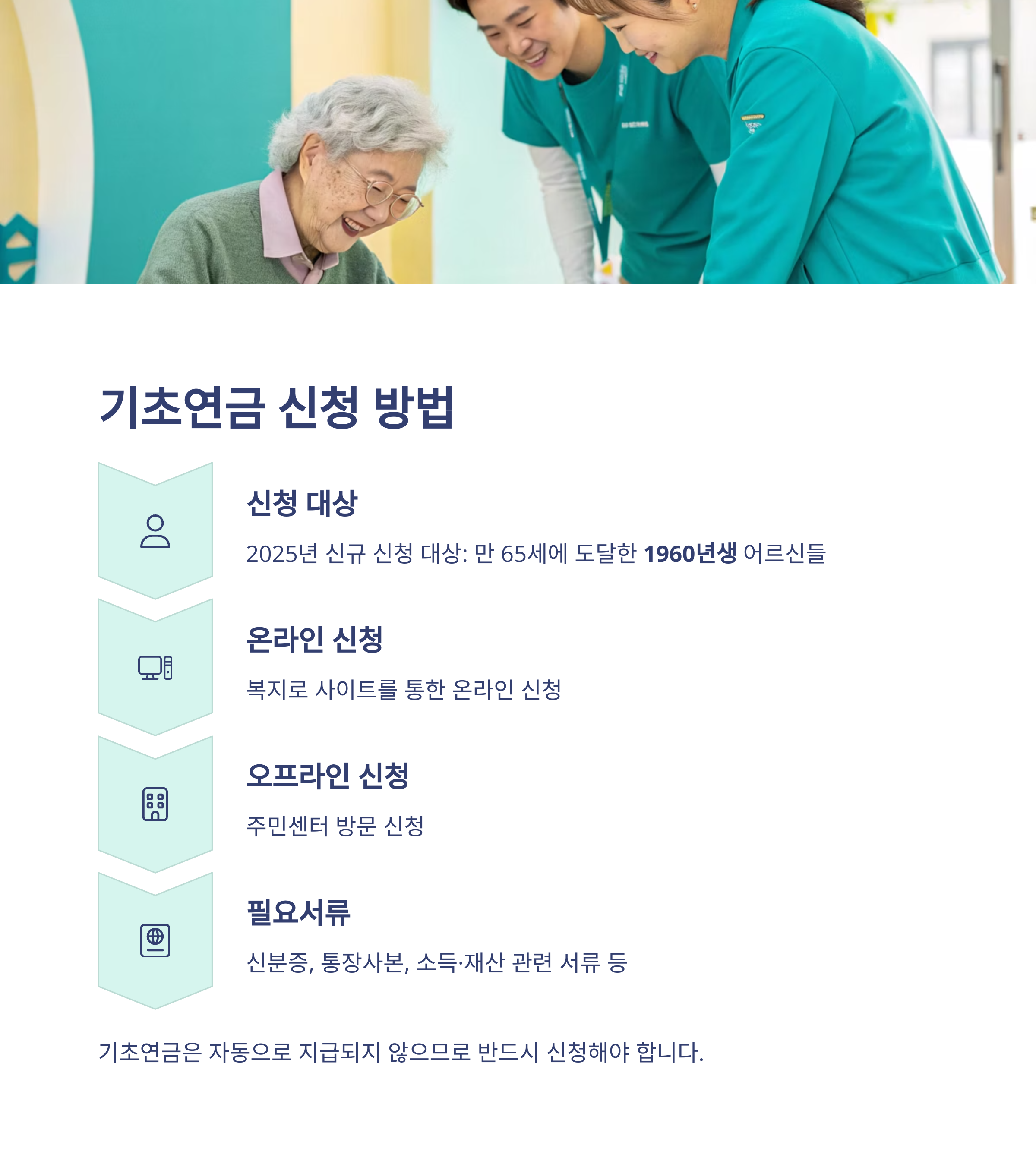 “아니, 나도 기초연금 받을 수 있어?”라고 생각하셨다면, 올해는 꼭 확인하셔야 해요. 2025년 신규 신청 대상은 바로 만 65세에 도달한 1960년생 어르신들입니다. 기존 수급자라면 자동으로 인상분이 반영되지만, 신규 대상자는 꼭 신청 절차를 거쳐야 해요.