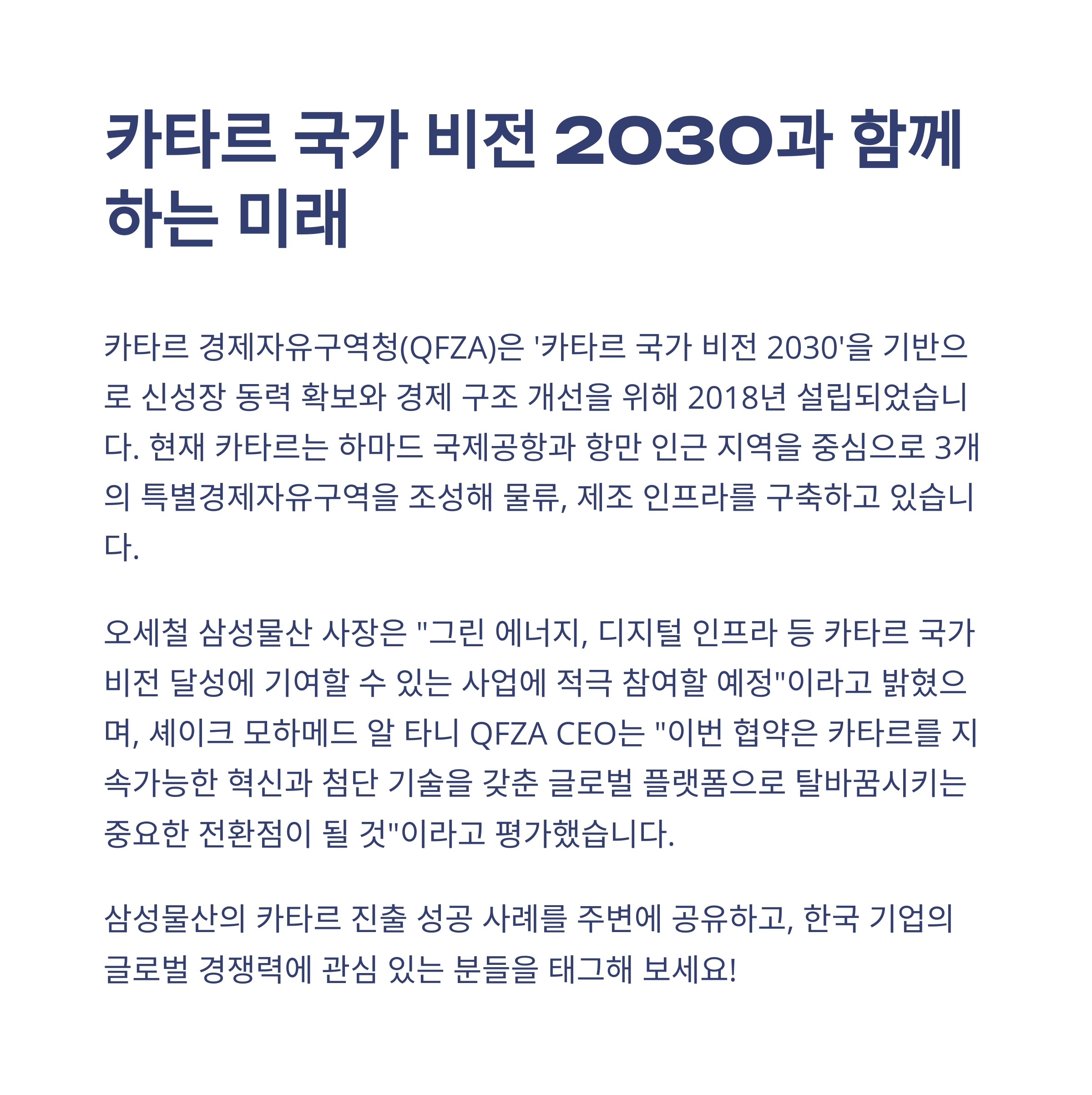 QFZA는 단순한 투자청이 아닙니다. 카타르의 경제 체질을 친환경·고부가가치 산업 중심으로 개편하기 위한 핵심 기관이에요. 이 기관이 설계한 국가 비전 2030은 단지 미래를 향한 계획이 아니라 현재 실현 중인 전략이기도 하죠. 삼성물산이 이들과 손잡은 건 단기 이익 이상의 ‘포지션 선점’이라고 볼 수 있어요.