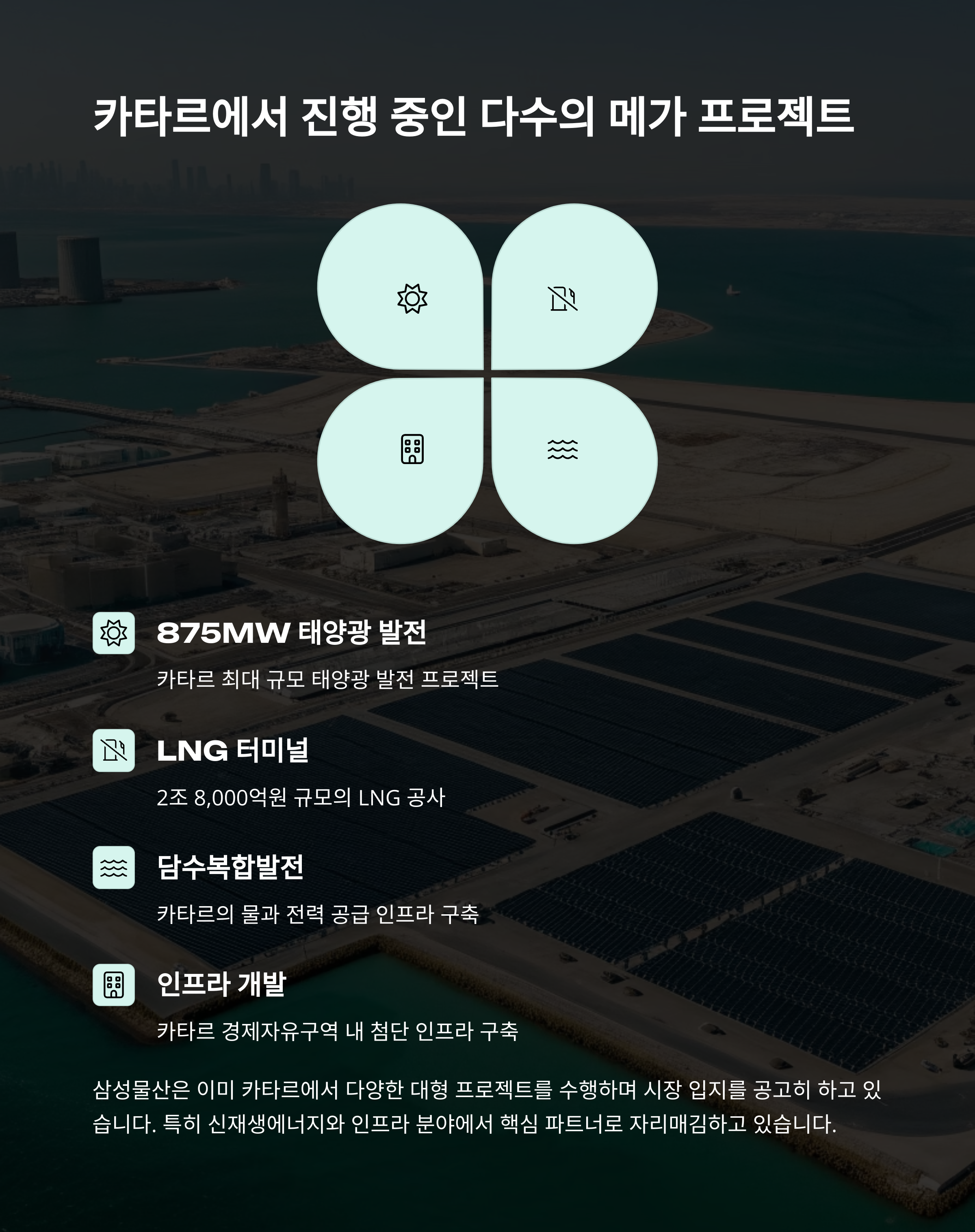 삼성물산은 Facility E 외에도 카타르 전역에서 다양한 에너지 인프라 프로젝트를 수행하고 있습니다. 현재 진행 중인 대표 사업은 875MW 초대형 태양광 발전 프로젝트인데요, 이는 카타르 최대 규모의 신재생에너지 발전소로 평가받고 있어요. 그 외에도 2.8조원 규모의 LNG 터미널 시공도 병행 중입니다.