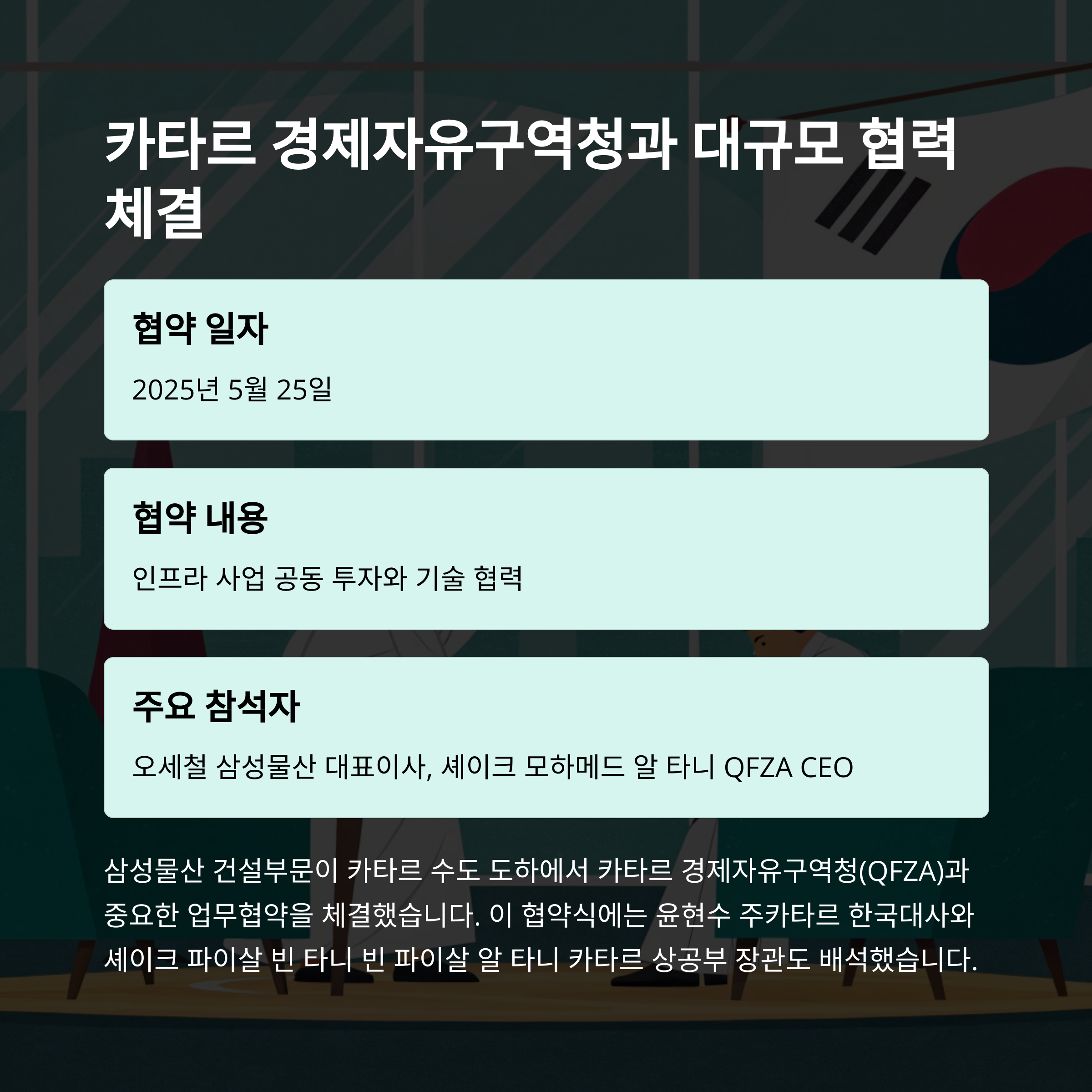 2025년 5월 25일, 삼성물산이 카타르 경제자유구역청(QFZA)과 체결한 전략적 업무협약은 단순한 수주 계약이 아닙니다. 오세철 대표이사와 셰이크 모하메드 알 타니 CEO가 손을 맞잡고, 지속가능한 성장과 기술 협력을 위한 새로운 길을 열었다는 점에서 의미가 크죠. 특히 이날 협약식엔 주카타르 한국대사와 카타르 상공부 장관까지 참석했으니, 양국의 관심이 얼마나 집중됐는지 짐작이 가실 거예요.