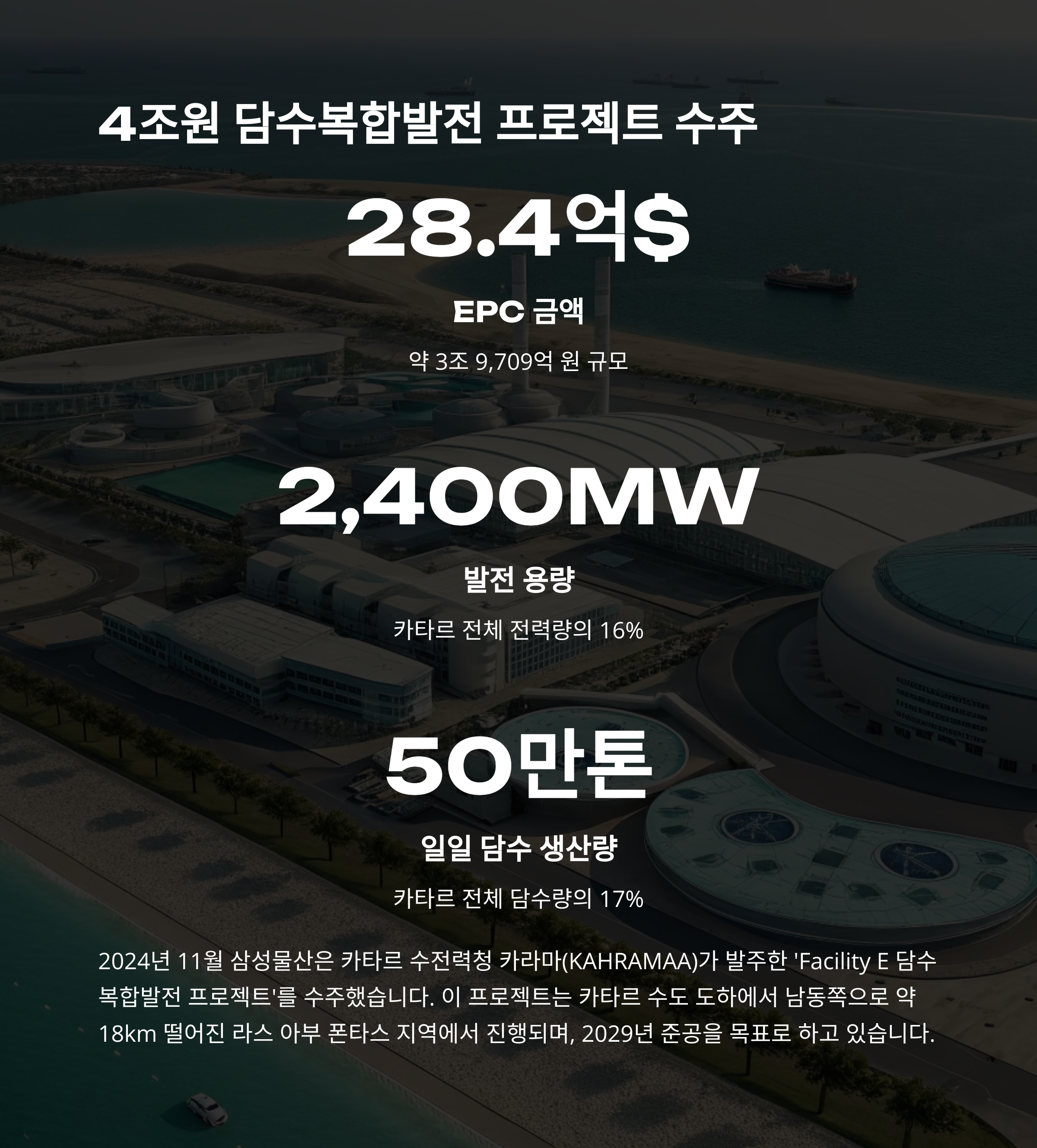 2024년 11월, 삼성물산은 Facility E 담수복합발전 프로젝트의 주 시공사로 선정되며, 중동 건설시장에서 다시 한번 존재감을 각인시켰습니다. 사업비 5조 원, 단독 수행, 카타르 전력의 16%를 담당할 이 프로젝트는 사실상 국가 기반 시설을 책임지는 역할을 하게 됩니다.