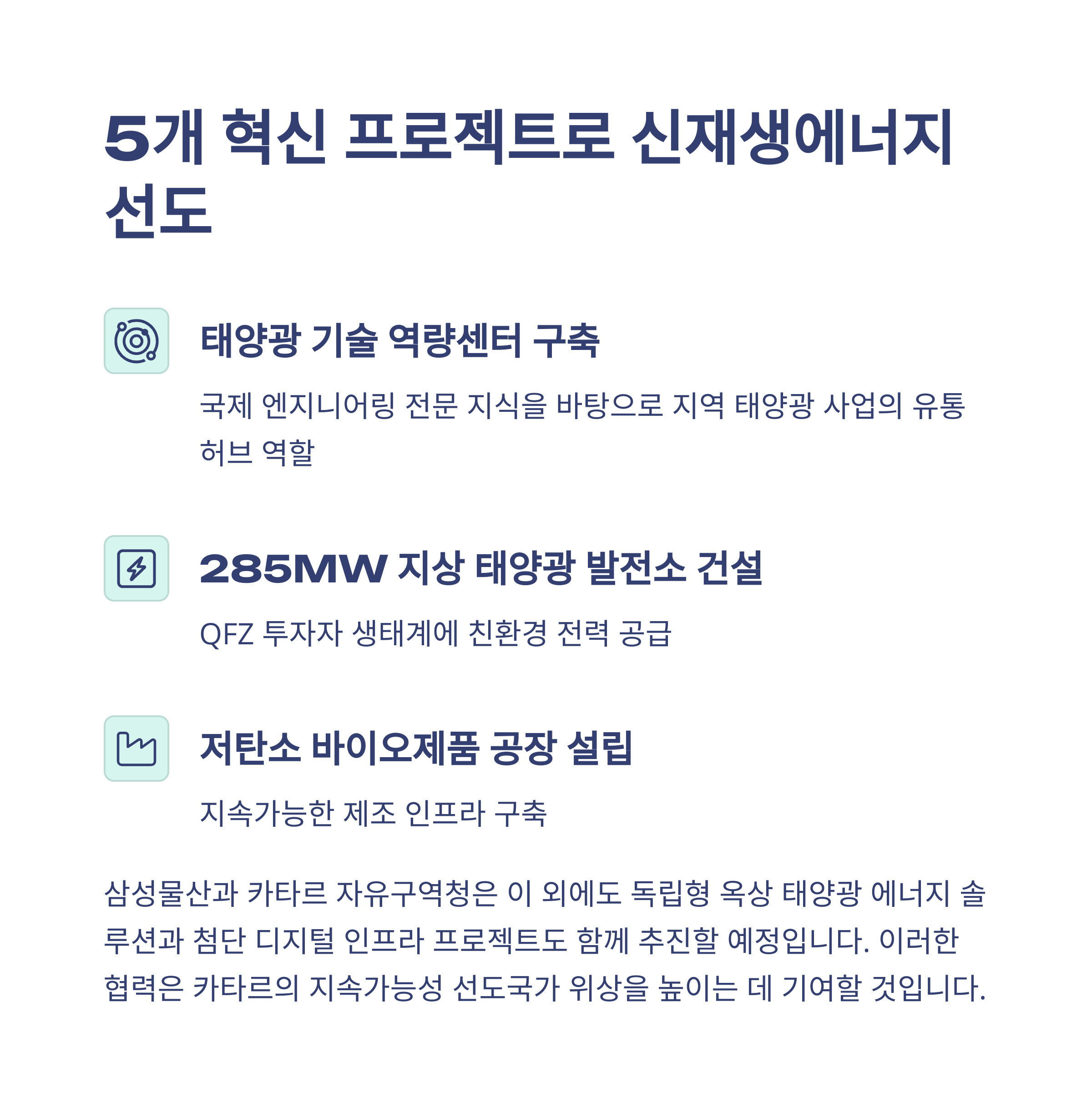 협약의 핵심은 총 5개의 혁신 프로젝트입니다. 여기에는 태양광 기술 역량센터와 지상 발전소, 옥상 태양광, 저탄소 바이오공장, 디지털 인프라까지 포함되어 있어요. 단순한 건설이 아니라, 카타르 경제의 녹색 전환을 실현할 기술적 기초를 구축하는 셈이죠.