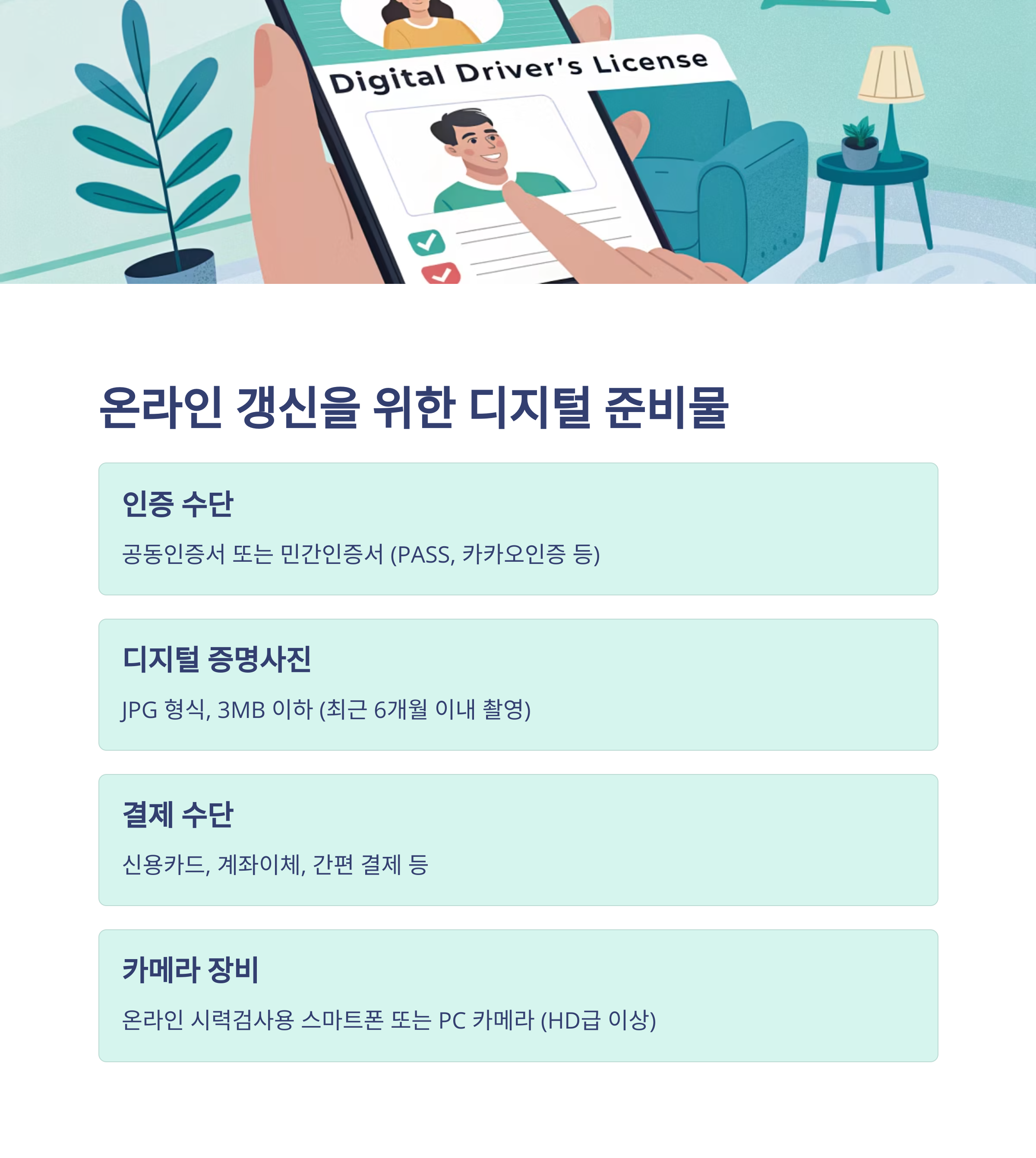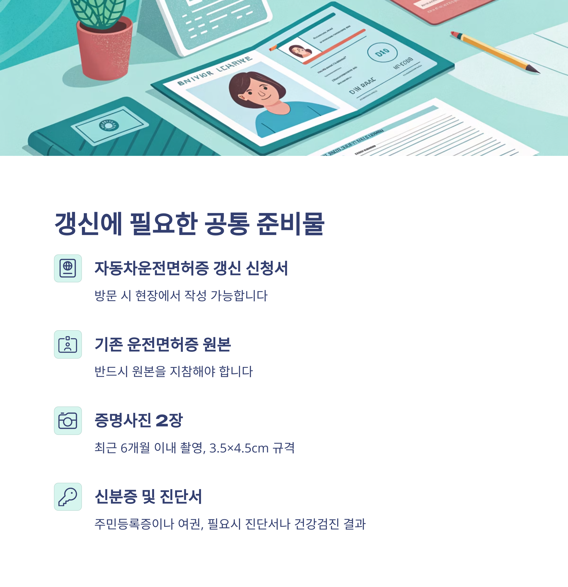운전면허 갱신은 서류가 빠지면 접수가 안 되기 때문에, 미리 꼼꼼히 챙겨가는 게 중요해요. 오프라인 갱신이든 온라인이든 기본적으로 필요한 준비물이 있어요. 특히 온라인 갱신의 경우 디지털 자료로 준비해야 할 것도 많기 때문에 이 부분도 꼭 체크해두세요!