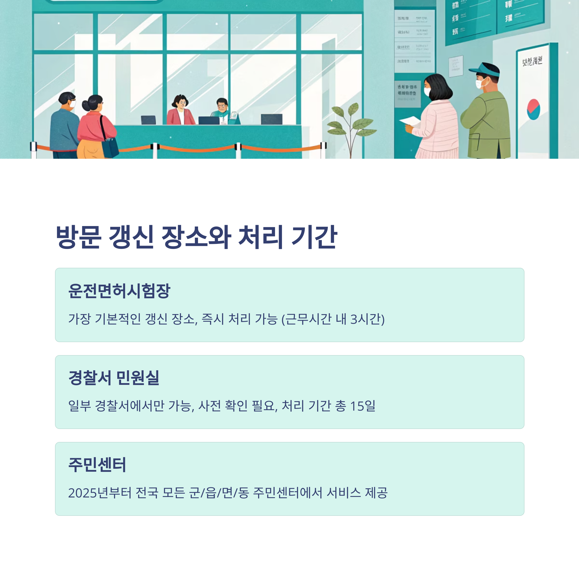 온라인이 불편하거나 디지털 인증에 익숙하지 않다면 직접 방문하여 갱신할 수 있어요. 다만 기관마다 처리 시간과 시스템이 다를 수 있으니 꼭 사전에 확인하고 방문하는 것이 좋습니다.