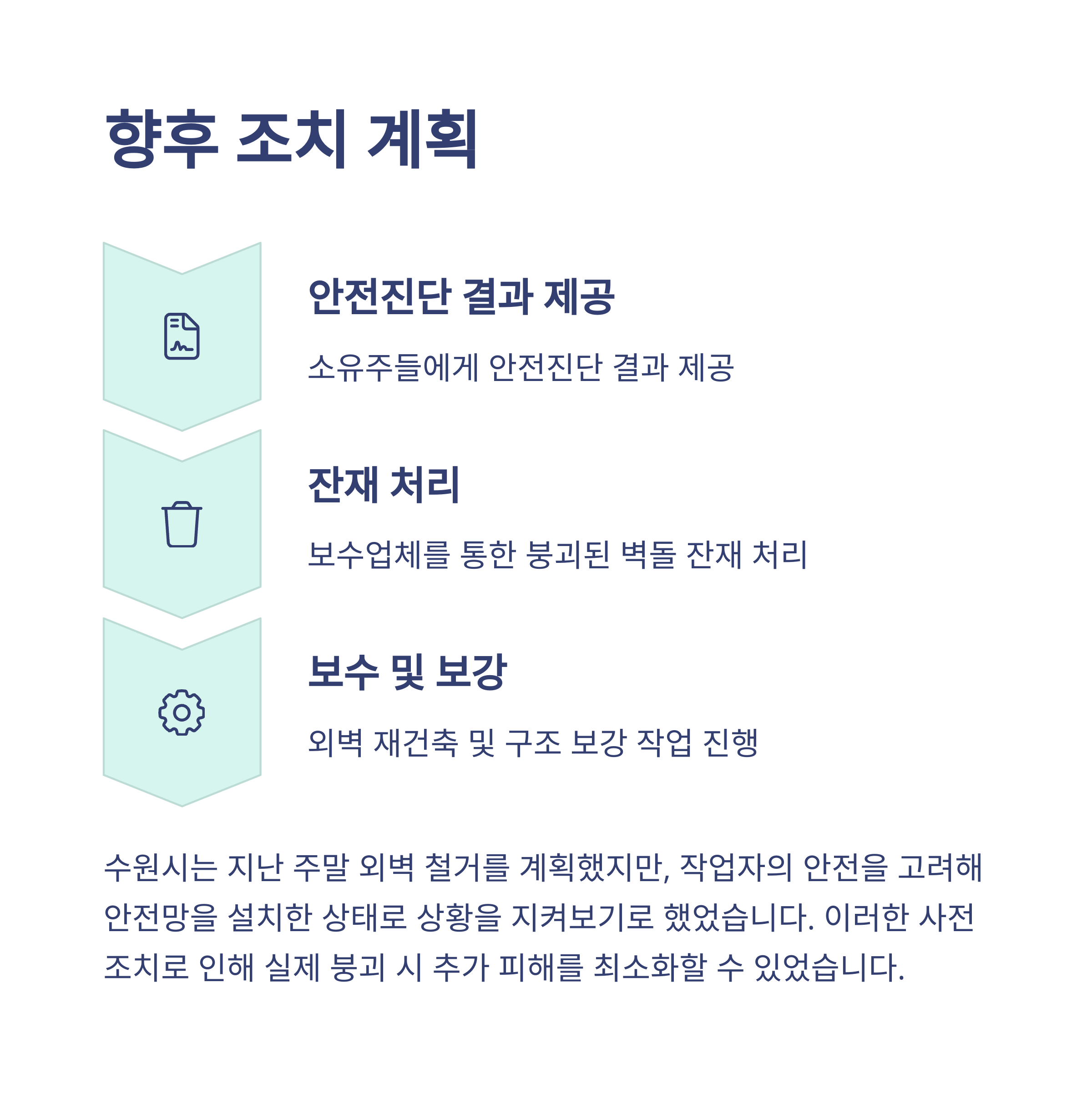 수원시는 정밀 안전진단, 대피 조치, 안전망 설치 등을 통해 선제적으로 대응했습니다.