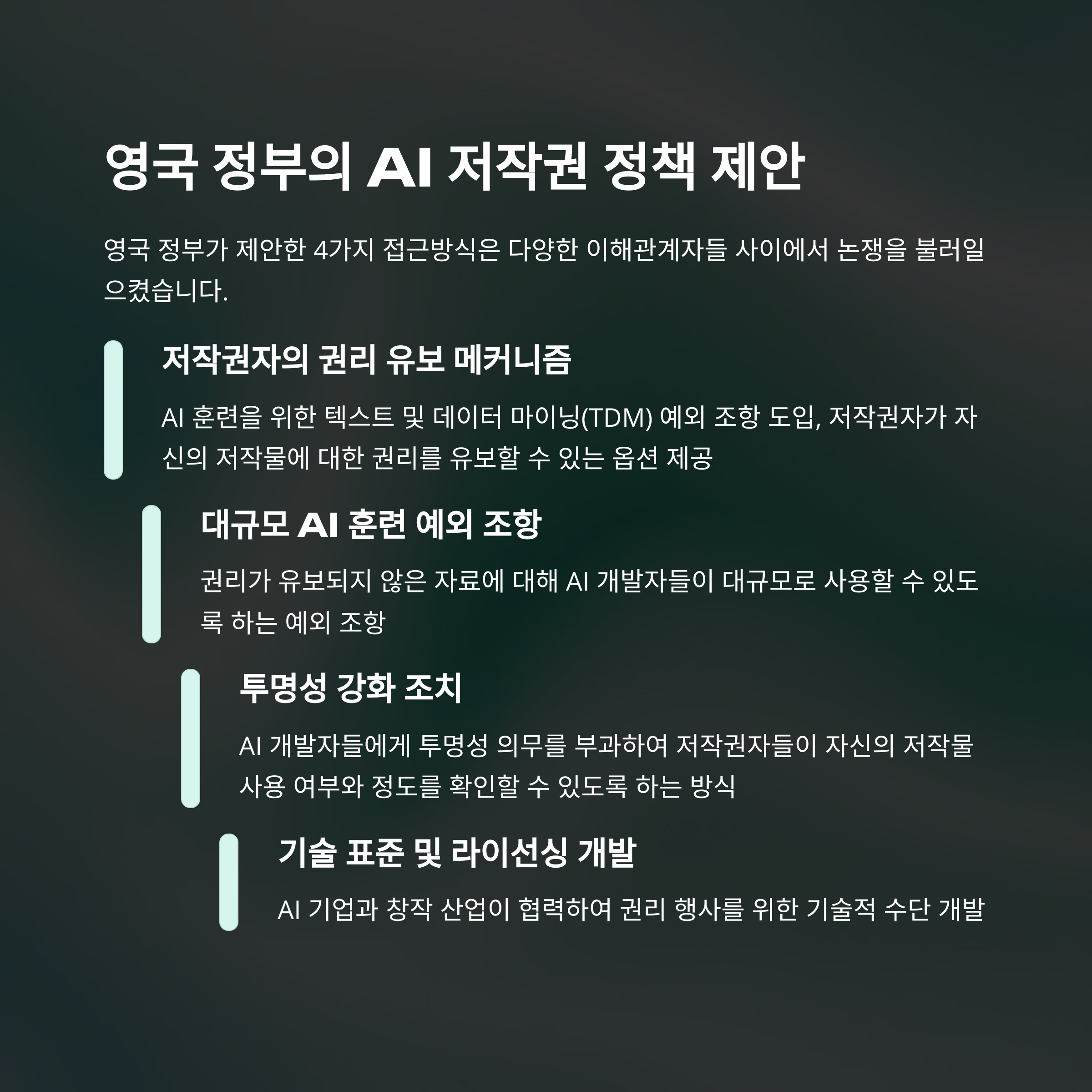 2024년 말부터 2025년 초까지 영국 정부는 AI와 저작권에 대한 설문조사를 실시했습니다. 여기서 제시된 네 가지 정책 옵션은 창작자들과 AI 기업 사이의 갈등을 선명하게 드러냈어요. 특히 TDM 면책 규정—텍스트 및 데이터 마이닝을 AI 학습 목적으로 면책하는 조항—은 가장 뜨거운 논쟁거리였습니다.