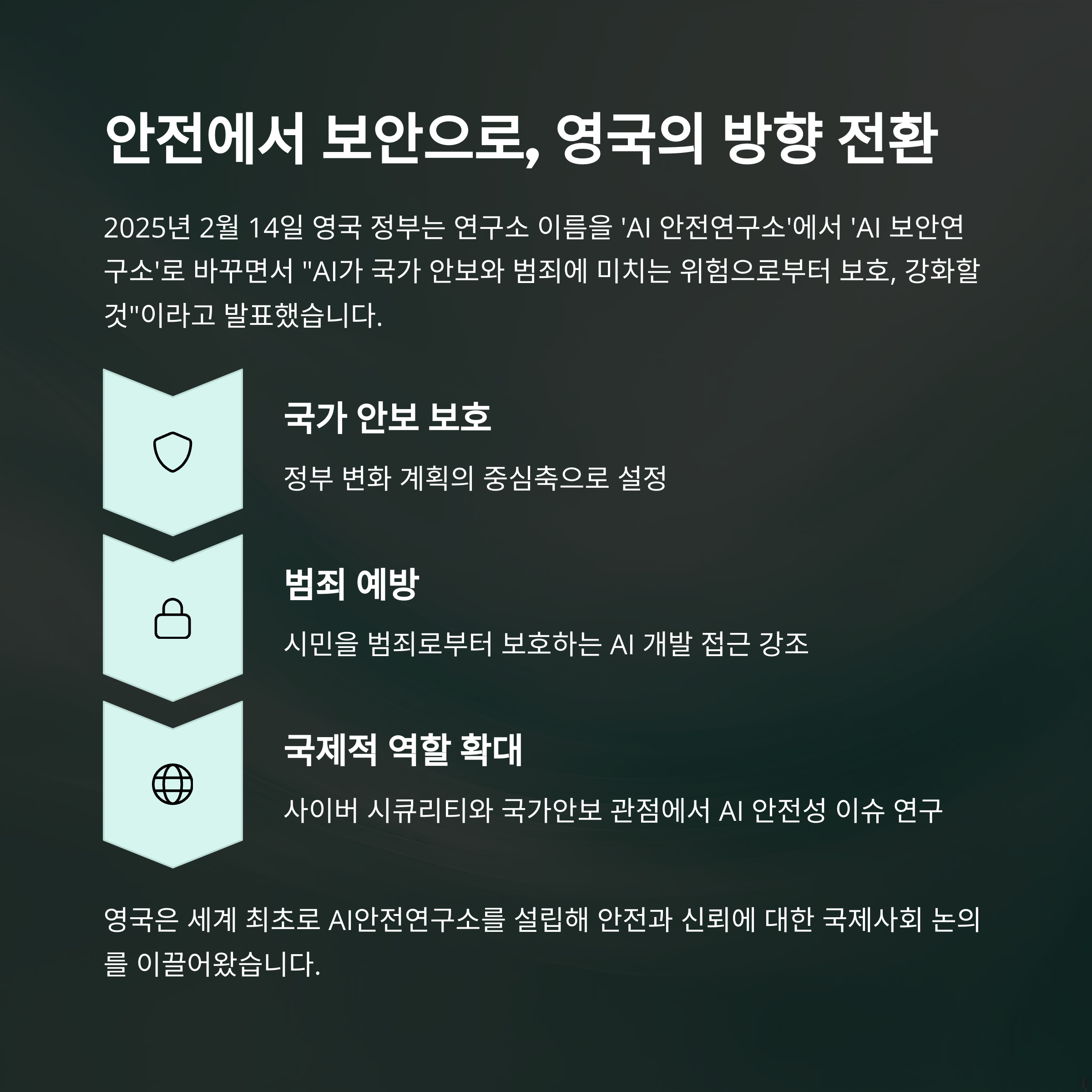 AI 안전연구소(Safety Institute)라는 이름으로 시작한 영국의 기관이, 이제는 'AI 보안연구소(Security Institute)'로 개명되었어요. 단어 하나 차이지만 메시지는 확실히 달라졌습니다. 이제 이 연구소는 기술적 안전성보다는 국가 안보와 범죄 대응 중심의 보안 전략에 집중합니다. 사이버 위협, AI 악용 범죄, 심지어는 디지털 전쟁까지 포함한 광범위한 영역이 연구 대상이에요.