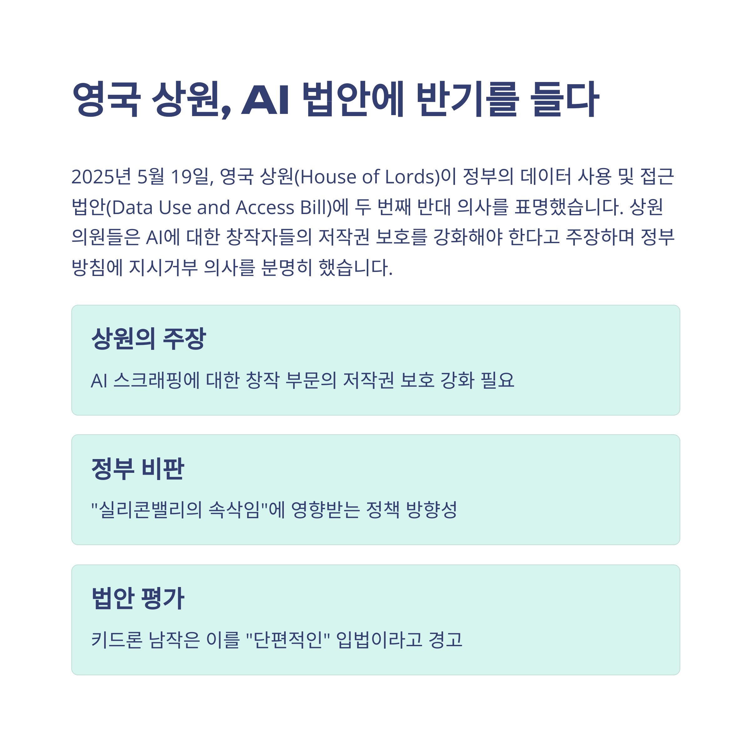 2025년 5월 19일, 영국 상원이 정부의 ‘데이터 사용 및 접근 법안(Data Use and Access Bill)’에 대해 이례적으로 두 번째 반대 의사를 밝혔습니다. 상원의원들은 정부의 데이터 개방 중심 정책이 창작자들의 권리를 침해한다고 판단했어요. 특히 인공지능 학습을 위해 방대한 데이터를 수집하고 가공하는 AI 기업들이 정당한 보상 없이 창작자들의 콘텐츠를 활용하는 현실에 문제의식을 제기했습니다. 이건 단순한 반대가 아니라 "민주적 디지털 문화"를 지키기 위한 저항으로 읽혀요.