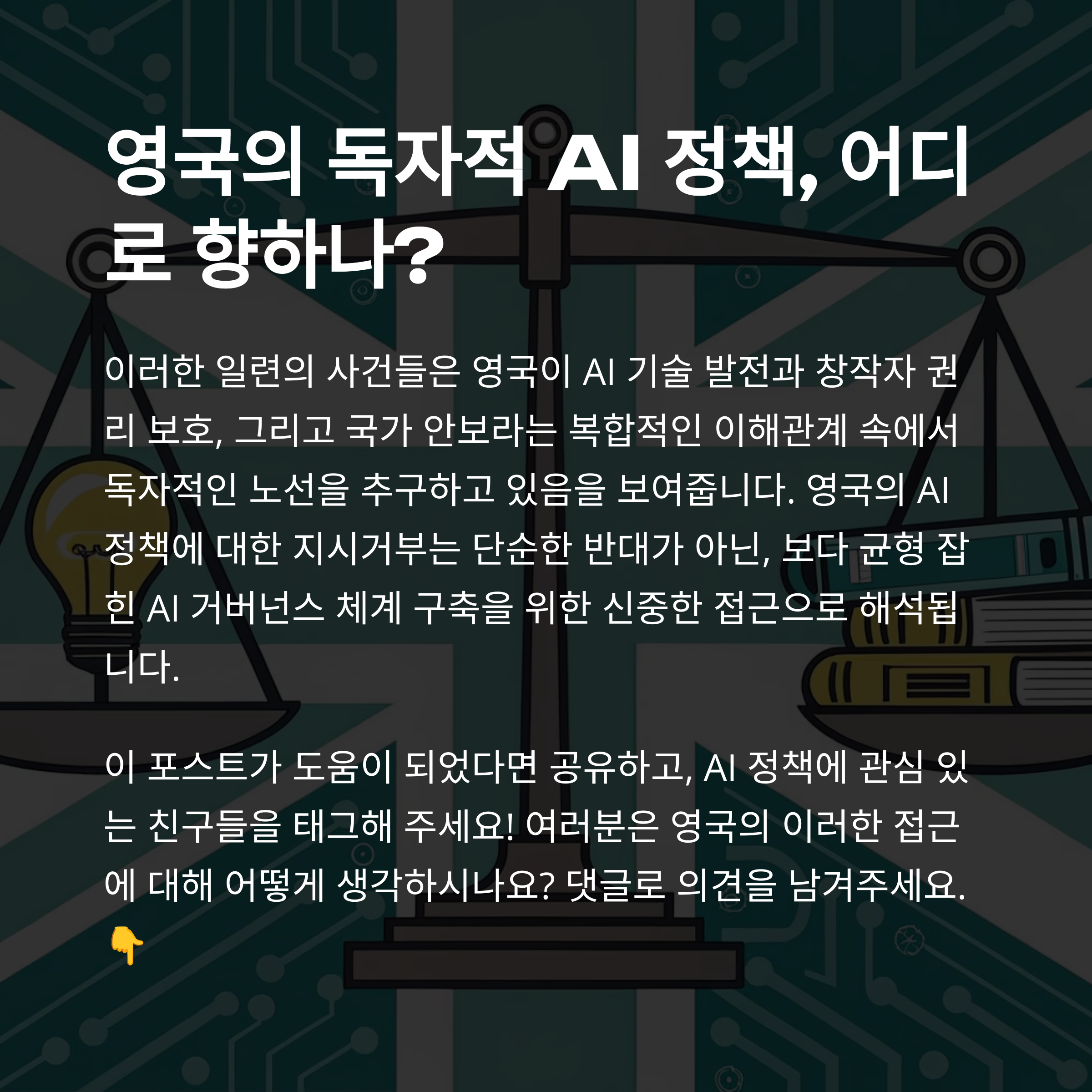 여러분, 오늘 이야기 어떠셨나요? AI가 만들어가는 미래 속에서 우리가 지켜야 할 가치는 과연 무엇일까요? 영국의 선택은 어쩌면 느리고 불편한 길일지 모르지만, 그 속엔 창작자의 권리, 국가 안보, 그리고 기술과 인간 사이의 균형이라는 깊은 고민이 담겨 있어요. 우리도 단순히 '기술이니까 괜찮아'라는 말로 넘기기 전에, 이 문제들을 함께 고민해봐야 하지 않을까요? 저도 앞으로 이 흐름을 계속 지켜보며 여러분과 더 많은 이야기를 나누고 싶어요. 댓글로 여러분의 생각도 꼭 들려주세요!