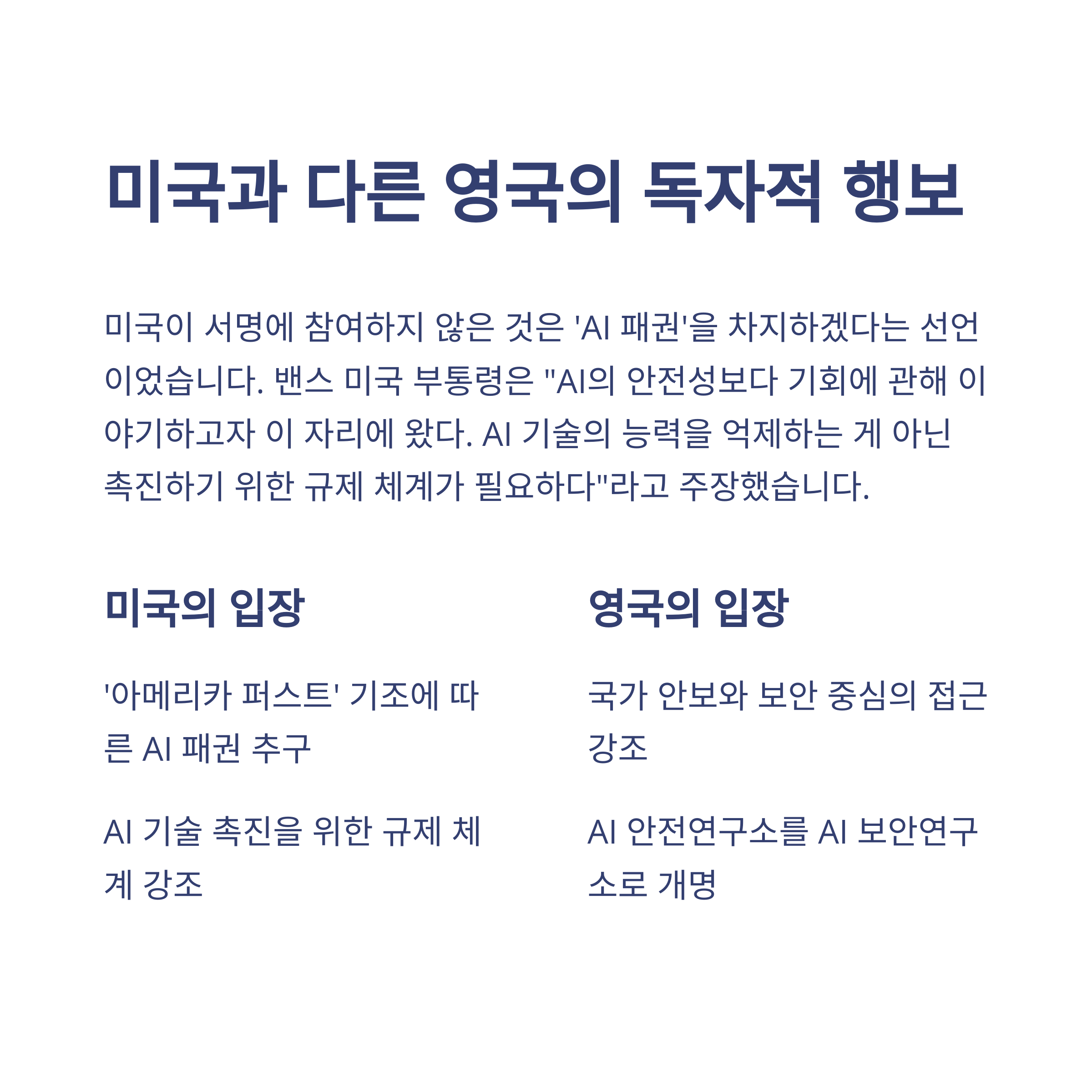 2025년 2월, 프랑스 파리에서 열린 AI 행동 정상회의. 여기서 영국은 공동 선언문 서명을 거부하는 독특한 결정을 내렸습니다. 그 이유는 "AI의 글로벌 거버넌스와 국가 안보 영향이 충분히 논의되지 않았다"는 입장이었죠. 한마디로, 선언문은 이상적이긴 해도 현실적인 리스크 대응이 부족하다는 겁니다. 미국은 자국 우선주의를 내세우며 서명을 거부했지만, 영국은 안보 중심이라는 다른 길을 택한 셈이죠.