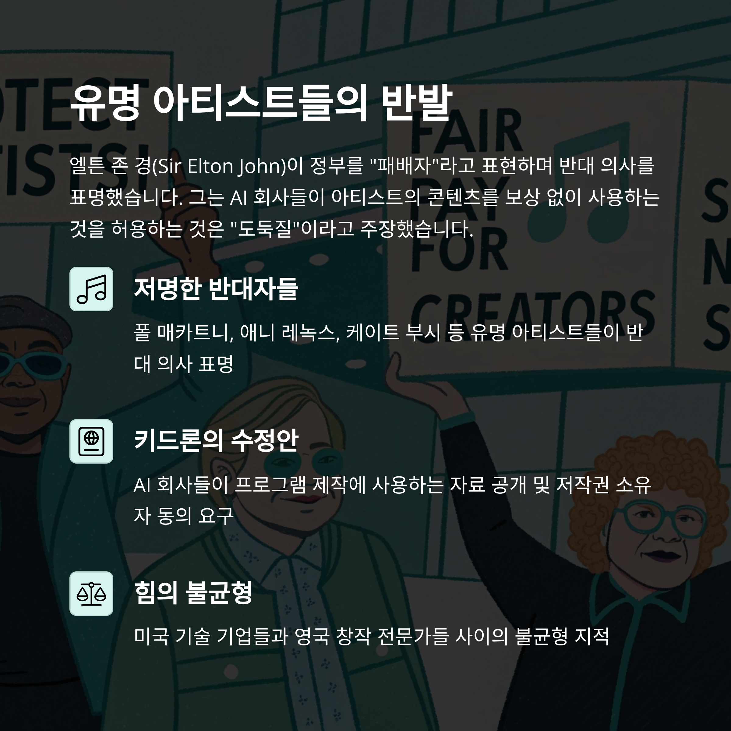 엘튼 존 경은 이번 논란에서 가장 강력한 발언을 한 인물 중 하나였습니다. 그는 “AI 회사들이 아티스트의 콘텐츠를 보상 없이 학습하는 것은 단순히 기술의 진보가 아니라 도둑질”이라고 규정했죠. 그의 발언은 단순한 개인 의견을 넘어서, 폴 매카트니, 케이트 부시, 애니 레녹스 등 수많은 문화예술계 스타들의 지지를 받았습니다.