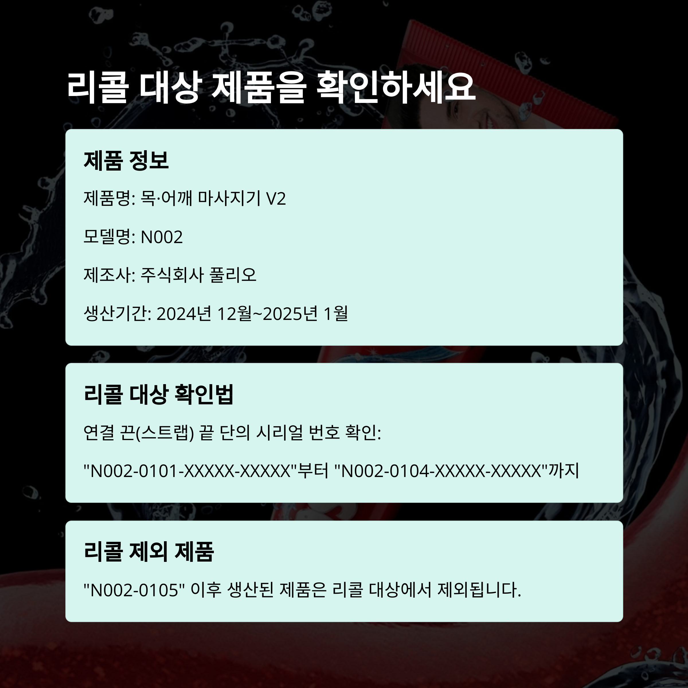- 리콜 제외 제품은? → "N002-0105" 시리얼부터 제외