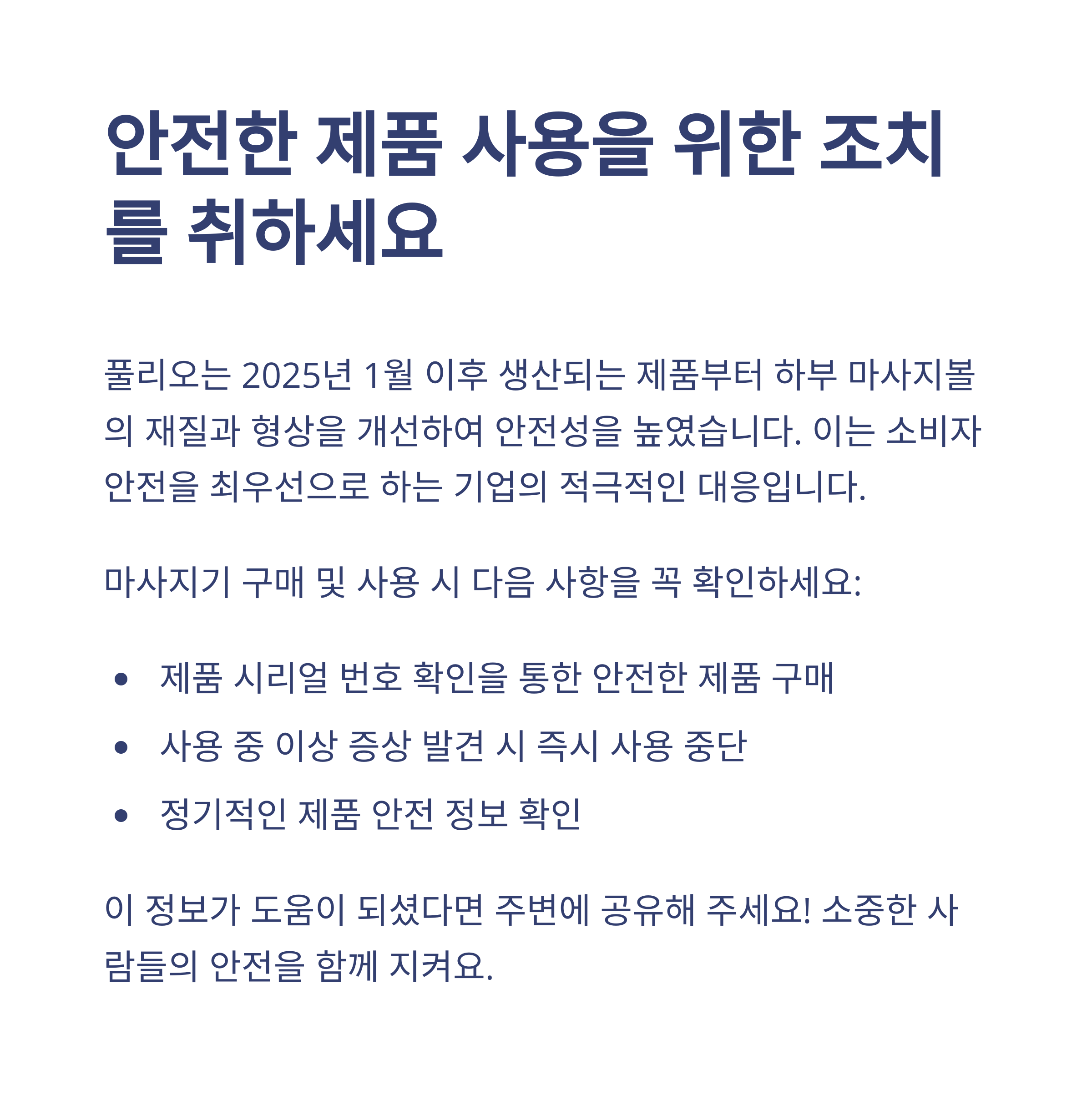 오늘 포스팅이 여러분에게 꼭 필요한 정보였기를 바랍니다. 혹시라도 아직 리콜 대상 제품을 가지고 계시다면 망설이지 마시고 풀리오 공식 홈페이지나 고객센터(☎ 1551-0879)를 통해 교환 신청을 진행해보세요. 일상 속 작은 습관이 큰 사고를 막아줄 수도 있다는 것, 꼭 기억해주세요. 앞으로도 이런 소비자 안전 정보는 빠르게 공유드릴게요. 오늘도 건강하고 안전한 하루 보내시길 바랍니다!