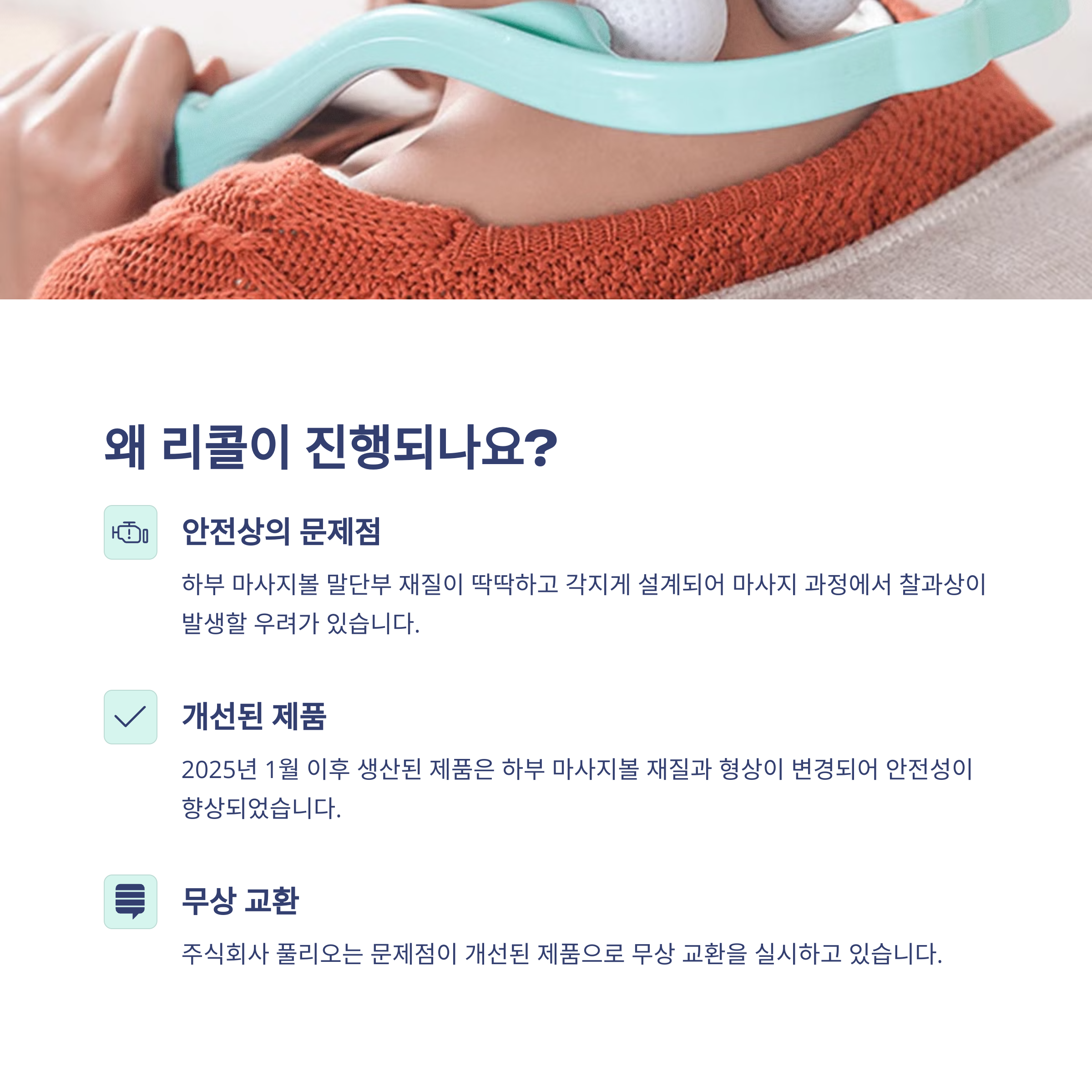 하부 마사지볼 재질 문제 딱딱하고 각진 구조로 찰과상 유발 2025년 1월 이후 개선 제품으로 교체