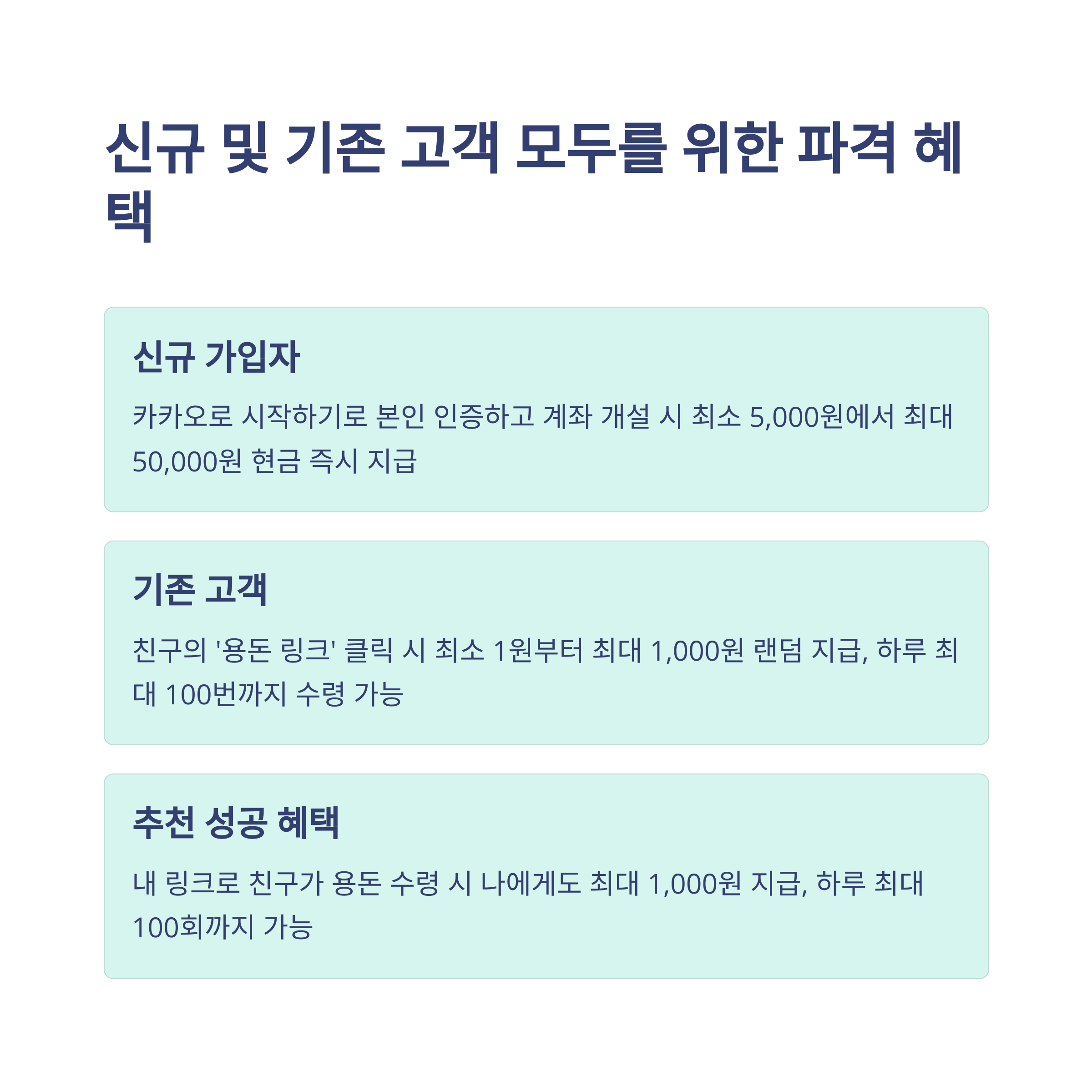 머니건 이벤트는 단순한 '이벤트' 수준이 아니에요. 처음 보는 사람도, 기존 사용자도 각자의 방식으로 혜택을 누릴 수 있도록 설계되어 있죠. 신규 가입자는 최대 5만 원, 기존 고객은 하루 100번까지 용돈 수령이 가능하고, 추천 보상까지 덤으로 받으니 거의 '돈이 자동으로 들어오는 구조'랄까요. 그야말로 앱테크의 끝판왕 느낌입니다.