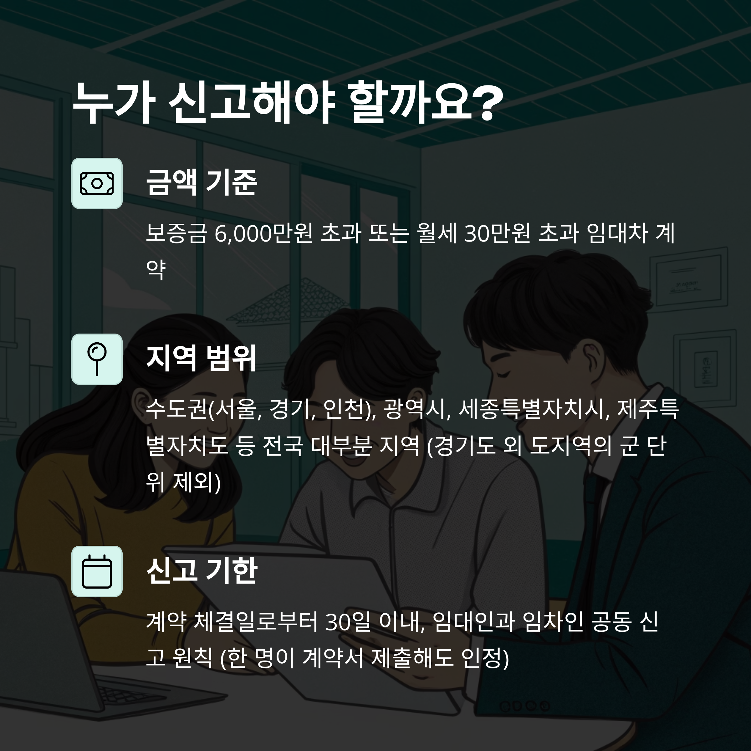 보증금 6천만 원 이하, 월세 30만 원 이하의 계약은 신고 대상에서 제외됩니다. 단, 금액 변경이 있는 갱신 계약은 예외입니다.