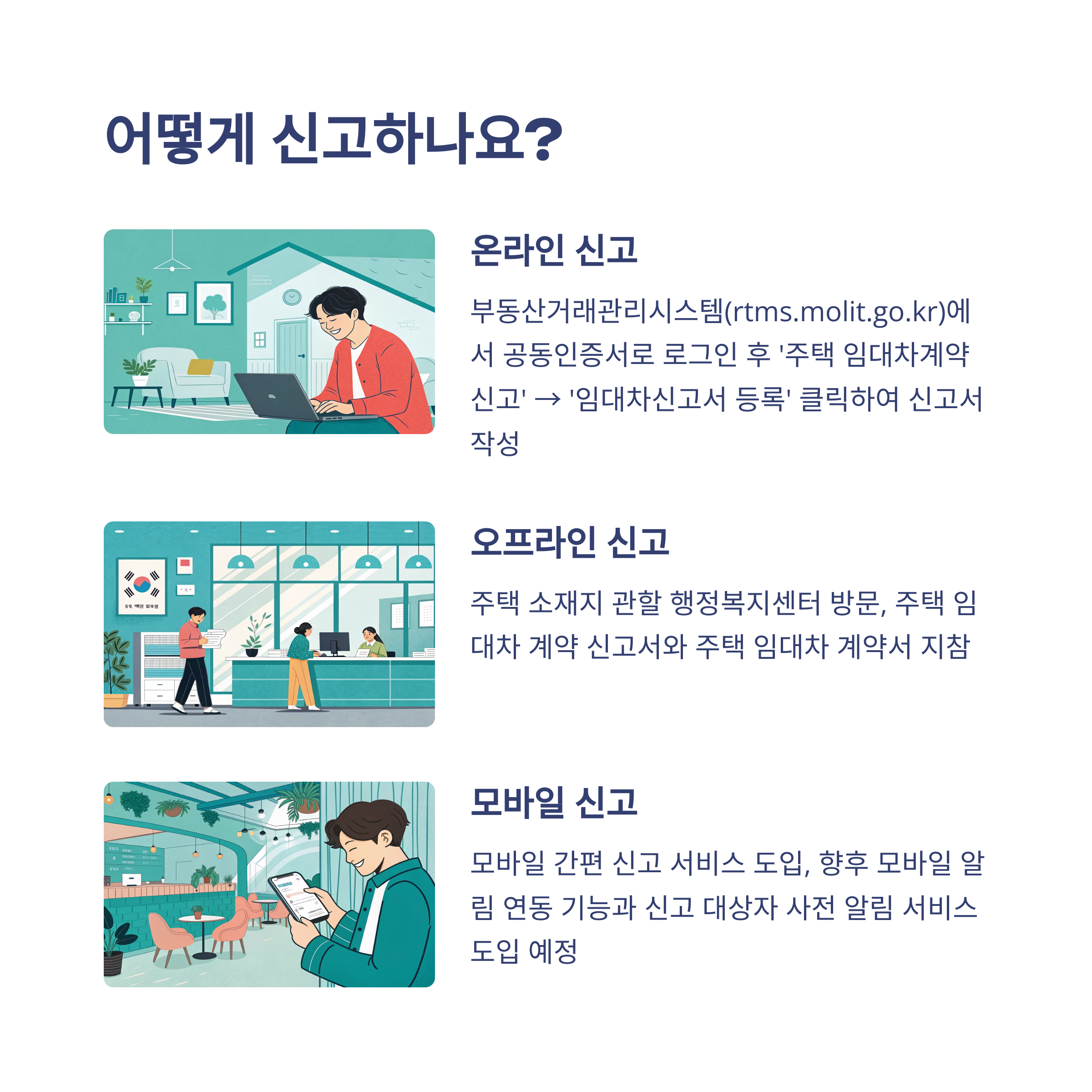 오프라인으로는 주택 소재지 관할 행정복지센터를 방문하면 되고요, 이때는 계약서와 신분증 등 기본 서류를 지참하면 됩니다. 그리고 모바일로는 정부24나 국토부 앱 등을 활용할 수 있는데, 앞으로는 알림 기능까지 연동될 예정이라니까 기대해볼 만해요.