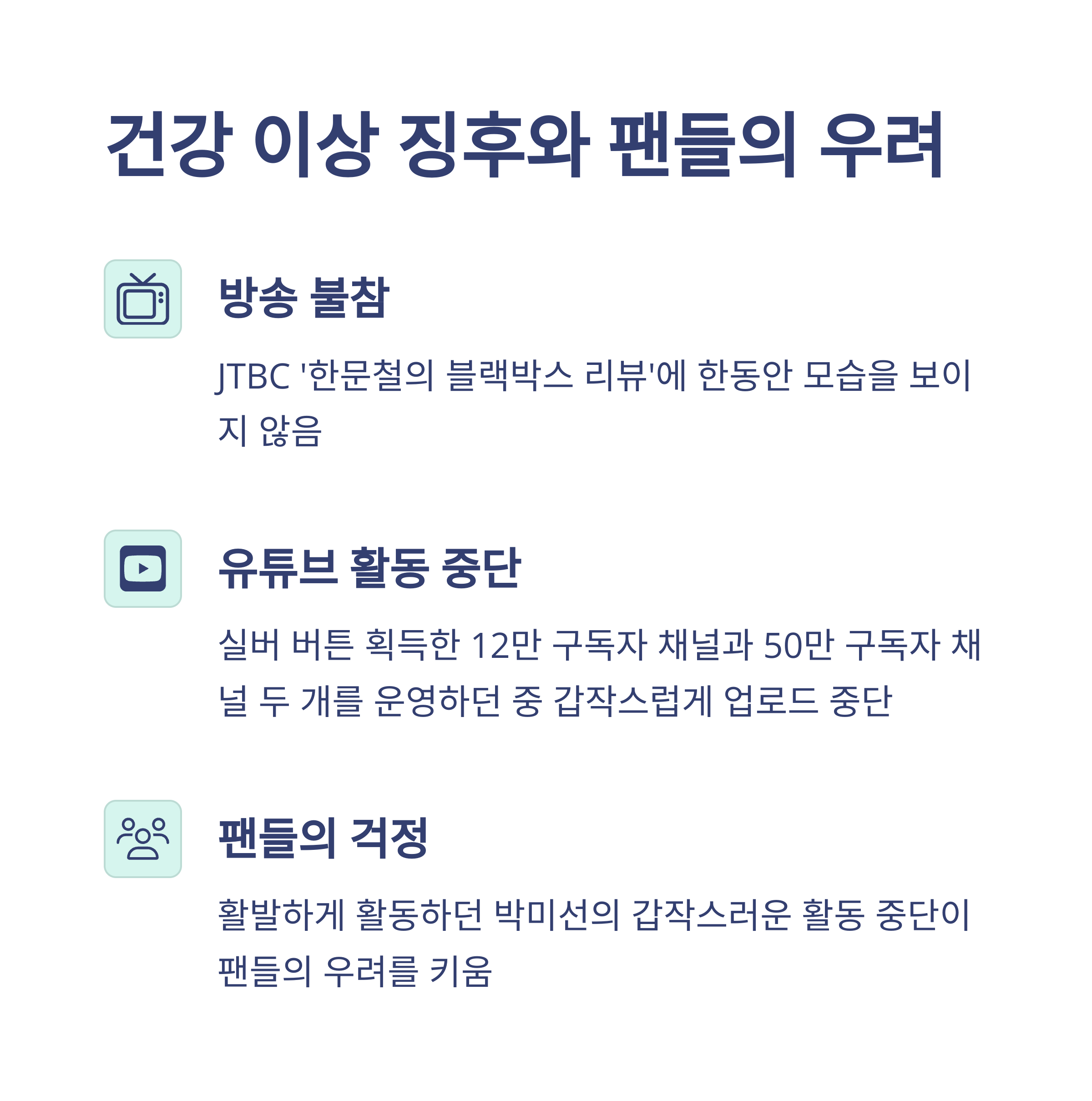 활동 중단 전후, 박미선의 건강 상태에 대해 팬들은 몇 가지 변화들을 감지했습니다. 특히 그녀가 출연 중이던 프로그램에서 갑자기 하차하거나, 활발하게 운영하던 유튜브 채널의 콘텐츠 업로드가 멈춘 점이 의심을 키웠습니다. 다음은 당시 변화한 활동 패턴입니다.