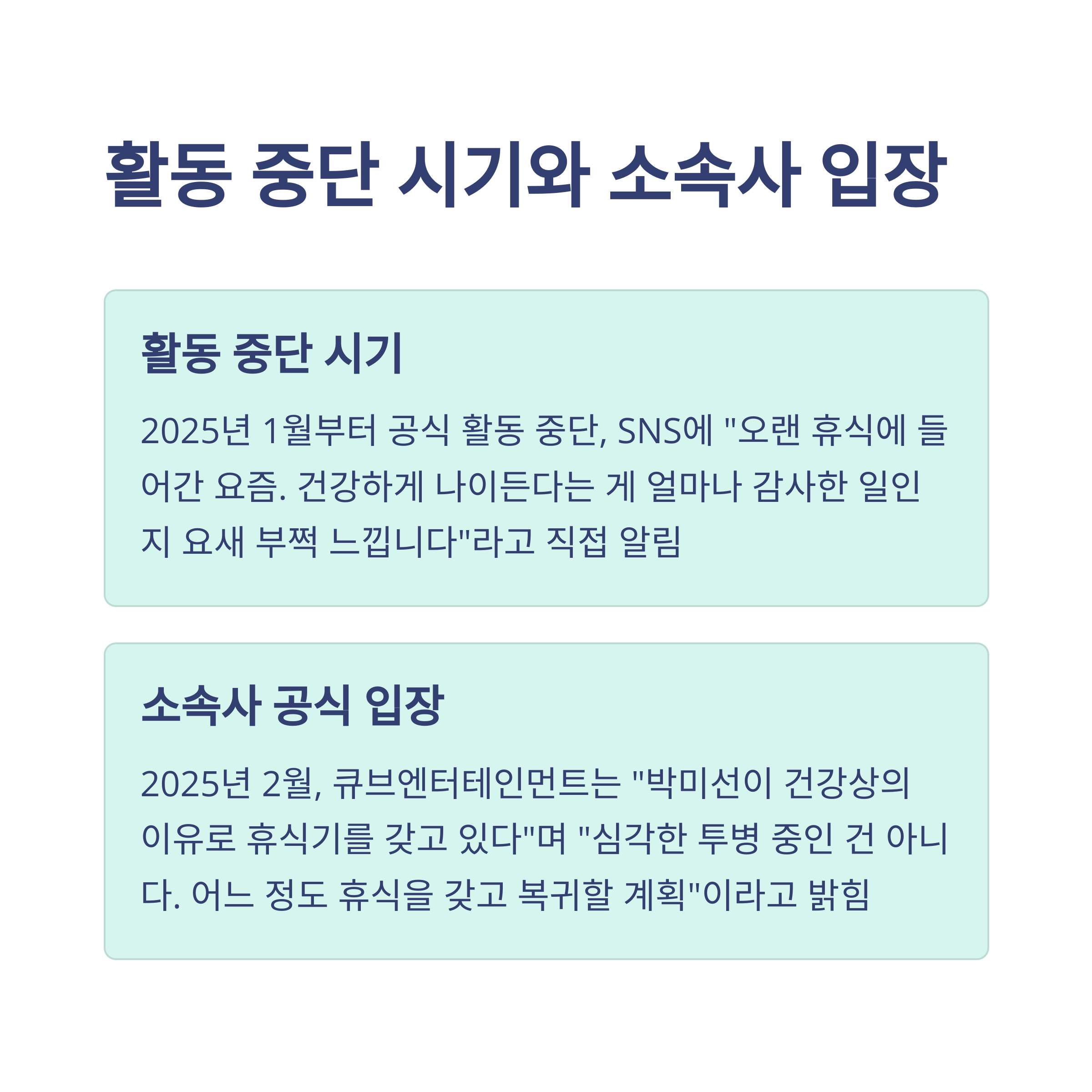 2025년 1월, 박미선은 본인의 SNS를 통해 "오랜 휴식에 들어간 요즘"이라는 글귀로 활동 중단을 암시했습니다. 그녀는 "건강하게 나이든다는 게 얼마나 감사한 일인지 요새 부쩍 느낍니다"라며 한층 성숙한 메시지를 전했습니다. 이후 2월, 소속사 큐브엔터테인먼트는 공식 입장을 발표하며 "건강상의 이유로 휴식기를 갖고 있으나 심각한 상황은 아니며 복귀 계획이 있다"고 밝혔습니다. 이로써 팬들은 그녀의 건강이 큰 위협은 아니라고 안도했지만, 여전히 걱정스러운 마음을 감추긴 어려웠죠.