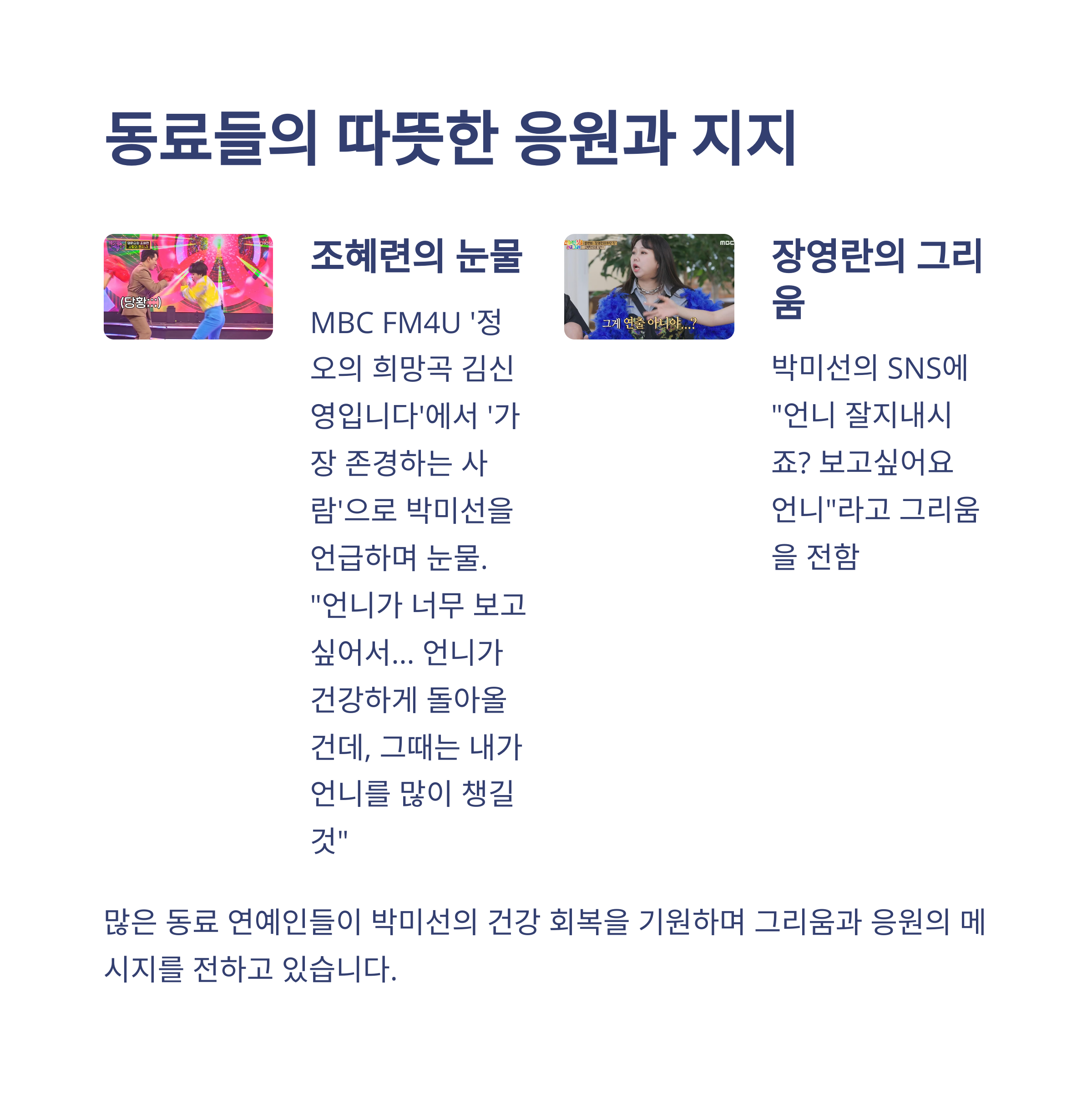 박미선이 자리를 비운 동안, 그녀의 빈자리를 애틋하게 여긴 동료 연예인들의 응원이 이어졌습니다. 가장 먼저 눈에 띄는 건 조혜련의 진심 어린 말이었죠. 라디오 방송 중 눈물을 보이며 "사랑한다는 말을 못 한 게 아쉽다"고 고백했고, 그녀와의 추억이 담긴 사진을 직접 편집해 SNS에 올리기도 했습니다. 장영란 역시 "언니 잘 지내시죠? 보고 싶어요"라는 짧지만 진심이 담긴 메시지를 전했죠. 이렇듯 박미선은 단지 방송인이 아닌, 사람들에게 마음을 주는 존재였음을 다시금 느끼게 했습니다.