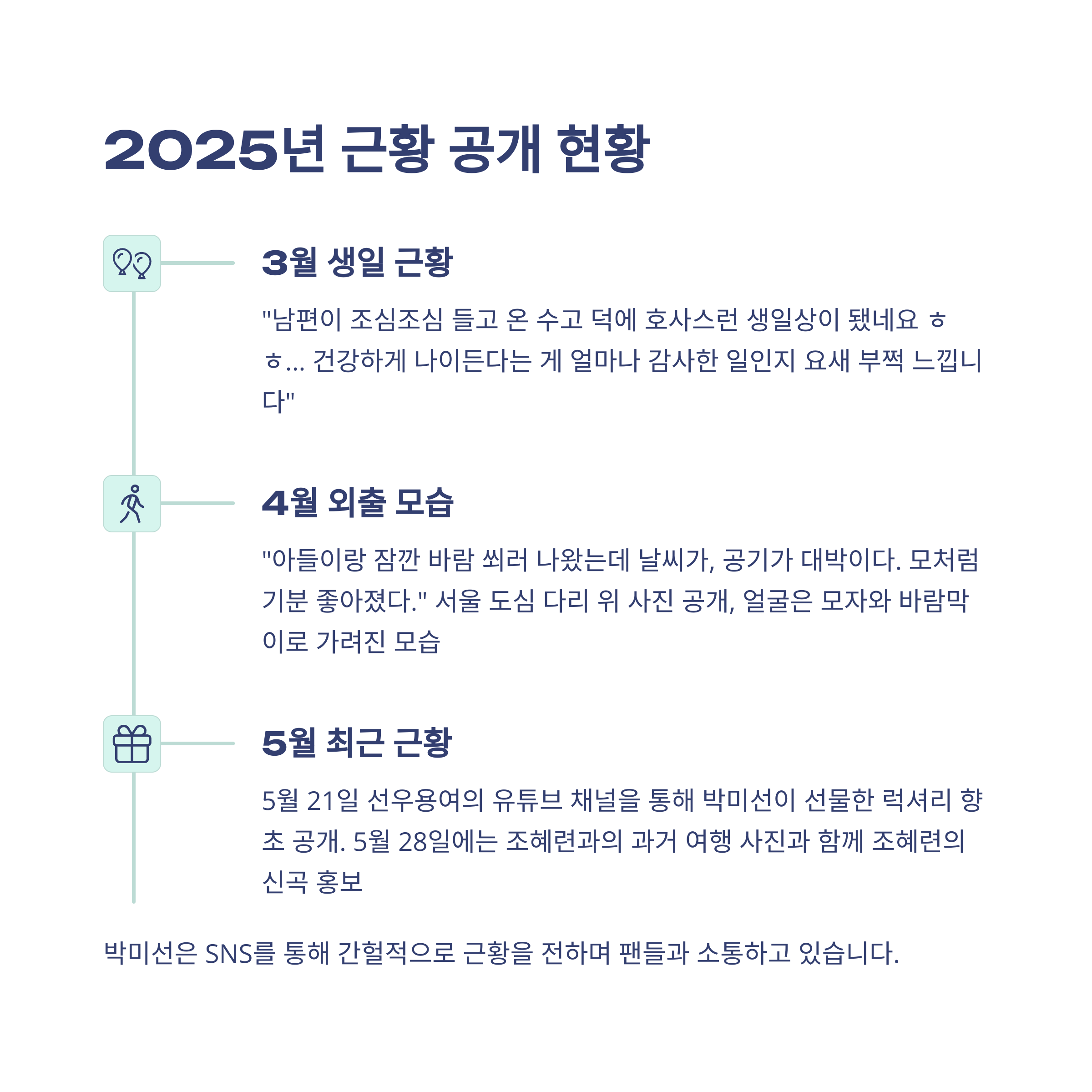 - 5월에는 지인들과의 소통을 통해 여전히 활동적임을 암시