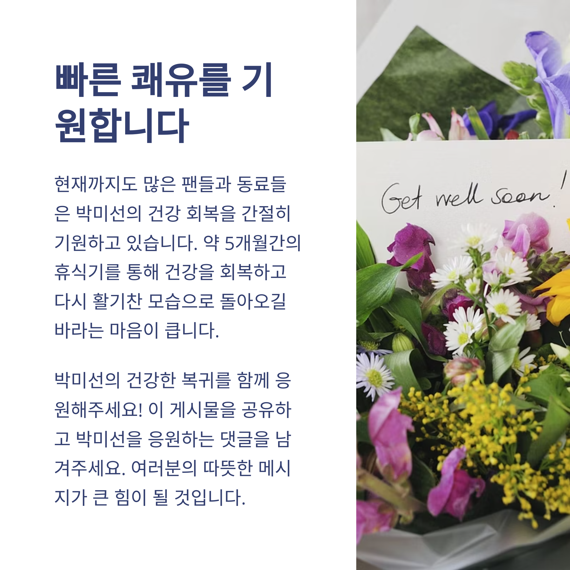 - “언제 돌아오셔도 좋으니, 제일 먼저 건강부터 챙기세요!”